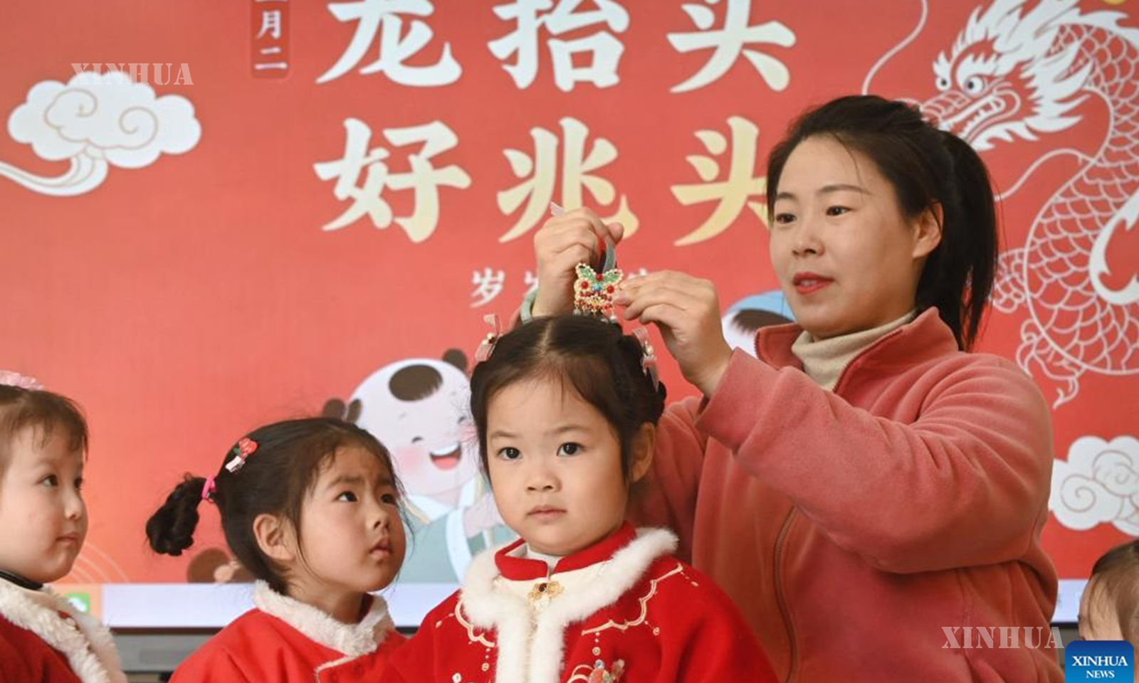A teacher braids a girl’s hair and adjusts her hair accessory at a kindergarten in Qinyang, central China’s Henan Province, on March 20, 2026. (Photo by Yang Fan/Xinhua)