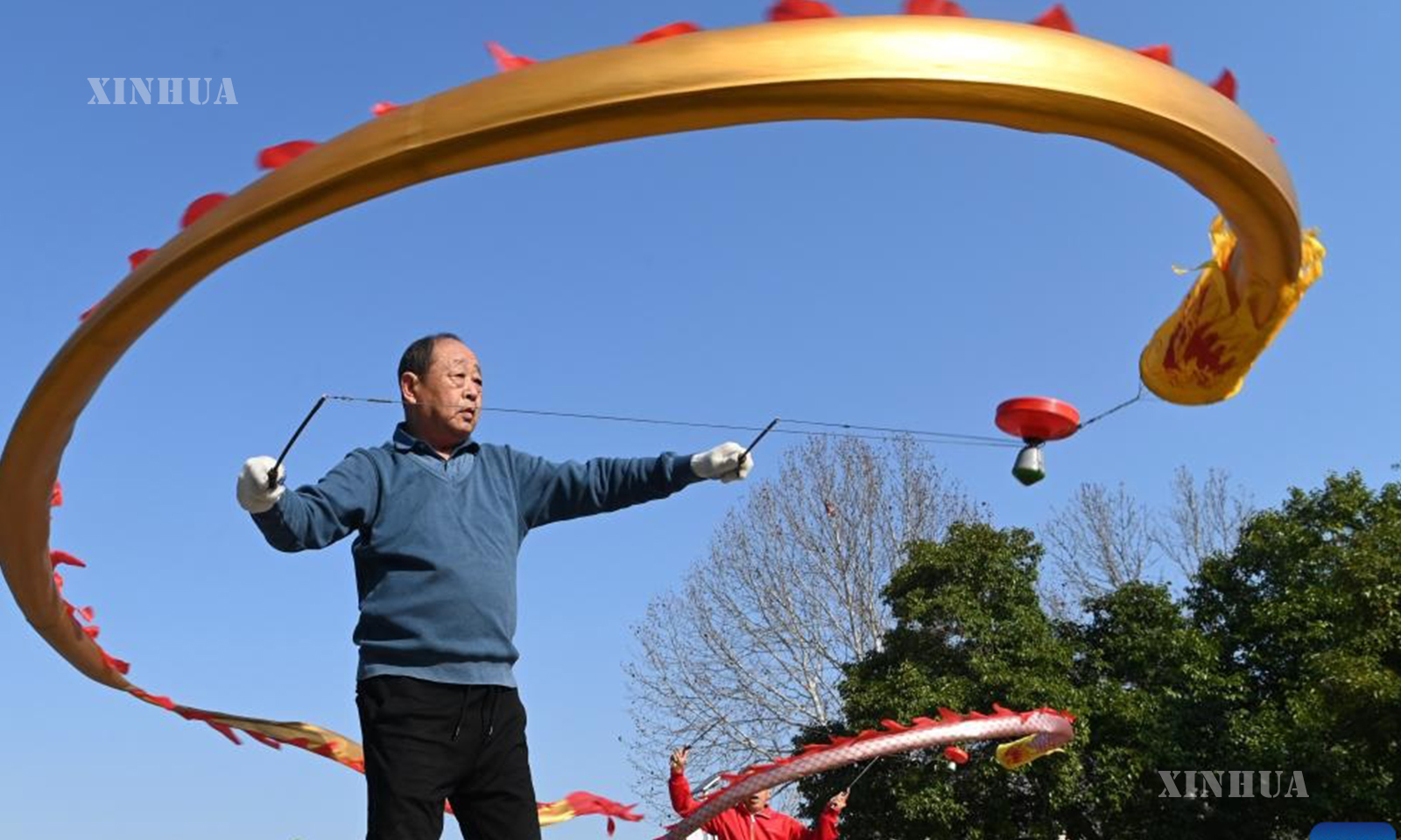 တရုတ်နိုင်ငံ မြောက်ပိုင်း ထျန်းကျင်းမြို့ရှိ ဥယျာဉ်တစ်ခုတွင် နဂါးအက ကပြဖျော်ဖြေတင်ဆက်နေသည့် အနုပညာရှင်များကို ၂၀၂၆ ခုနှစ် မတ် ၂၀ ရက်က တွေ့ရစဉ် (ဆင်ဟွာ)