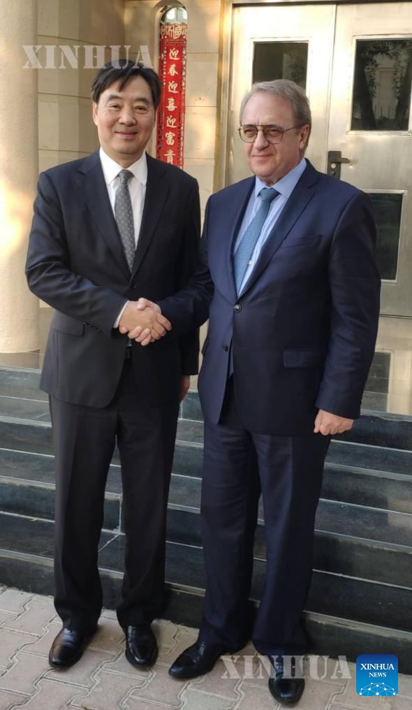 အရှေ့အလယ်ပိုင်းအရေးဆိုင်ရာ တရုတ်အစိုးရ၏ အထူးသံတမန် ကျိုက်ကျွင်းက ရုရှားနိုင်ငံ၏ ဒုတိယနိုင်ငံခြားရေးဝန်ကြီး၊ အရှေ့အလယ်ပိုင်းနှင့် အာဖရိကရေးရာ သမ္မတ၏ အထူးကိုယ်စားလှယ် မီခေးလ် ဘော့ဂ်ဒါနော့ဗ်နှင့် ကာတာနိုင်ငံ မြို့တော်ဒိုဟာတွင် ၂၀၂၃ ခုနှစ် အောက်တိုဘာ ၁၉ ရက်က တွေ့ဆုံစဉ် (ဆင်ဟွာ)