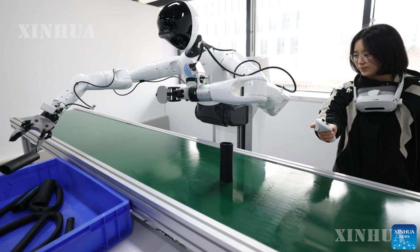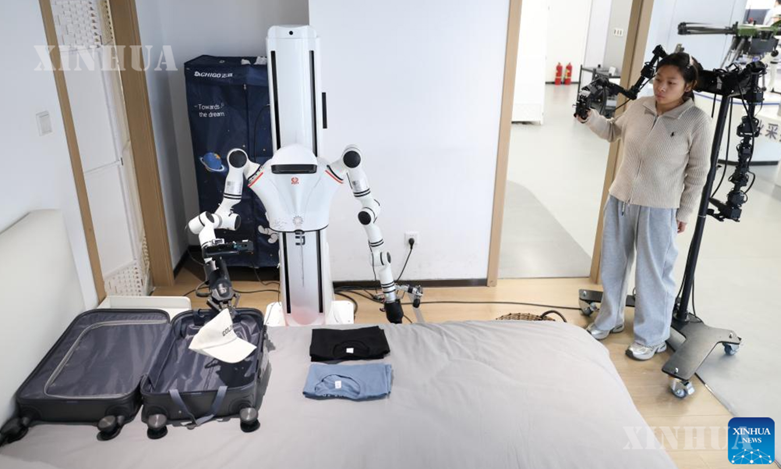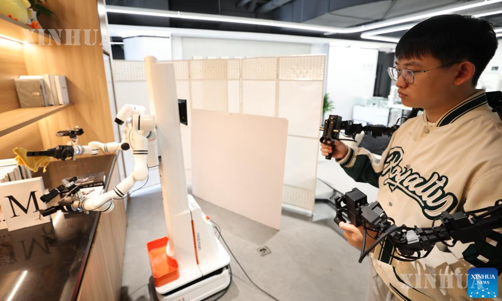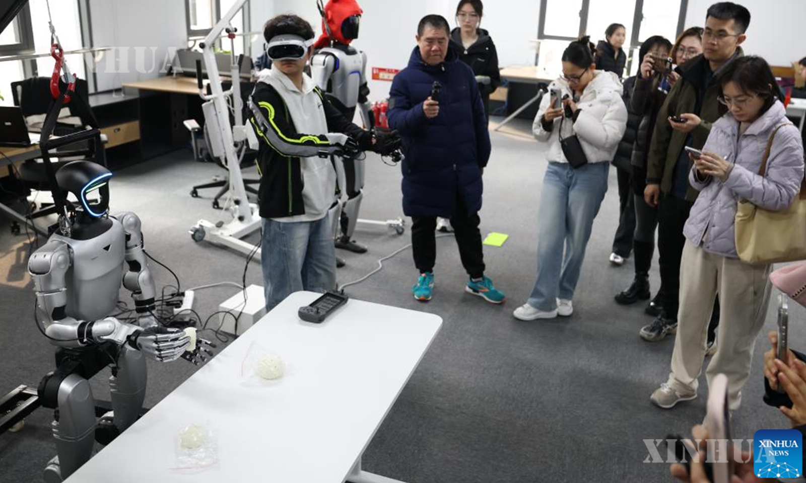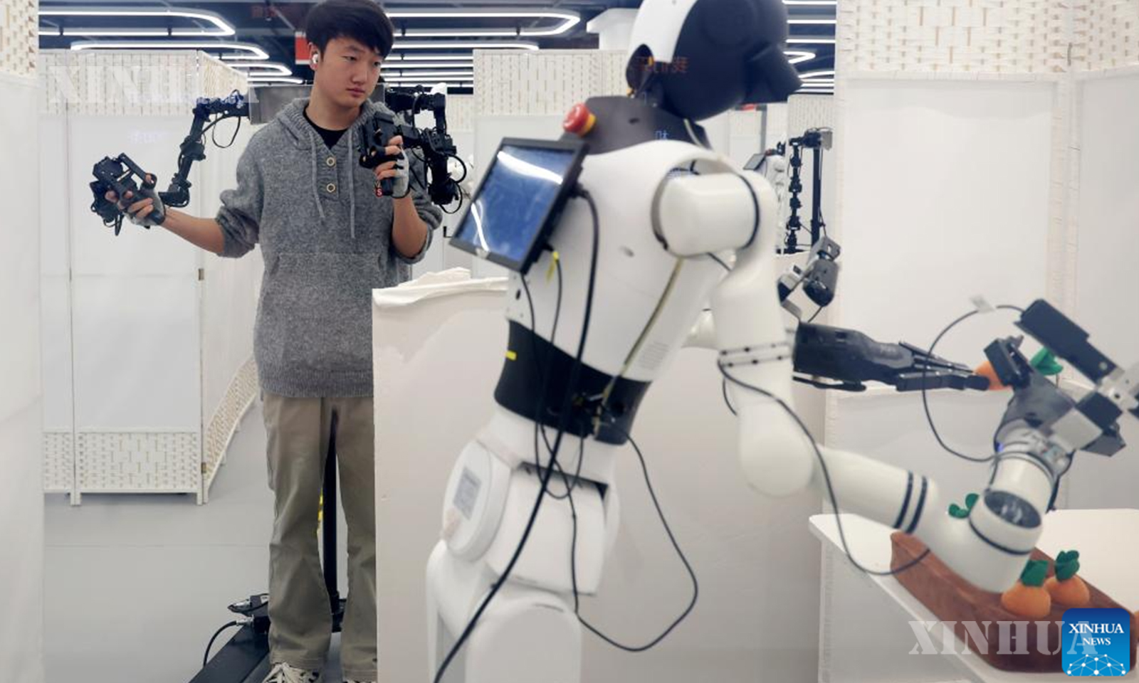A staff member trains a robot at the Robot Data Training Center in Shougang Park, Shijingshan District, Beijing, capital of China, March 25, 2026. (Xinhua/Zhang Chenlin)