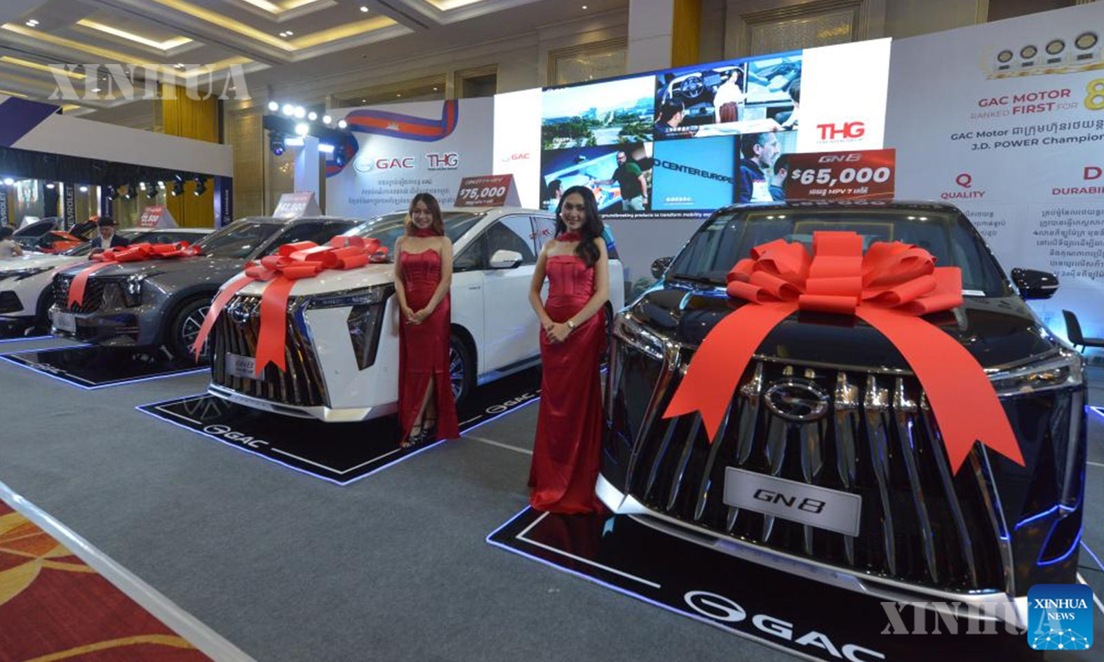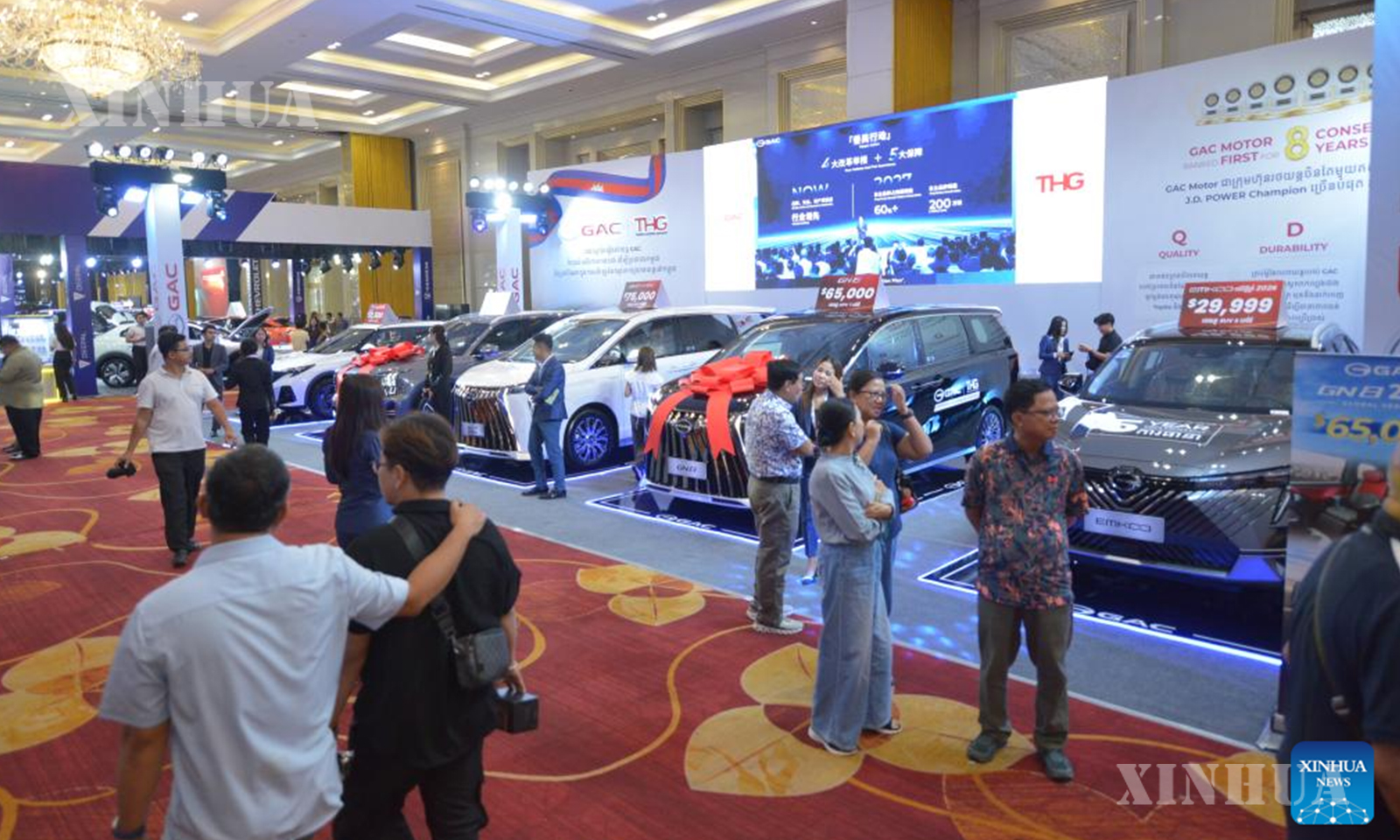ကမ္ဘောဒီးယားနိုင်ငံ မြို့တော်ဖနွမ်းပင်တွင် ကျင်းပသည့် ကားပြပွဲ၌ ပြသထားသော GAC ကားများကို ၂၀၂၆ ခုနှစ် မတ် ၆ ရက်က တွေ့ရစဉ် (ဆင်ဟွာ)