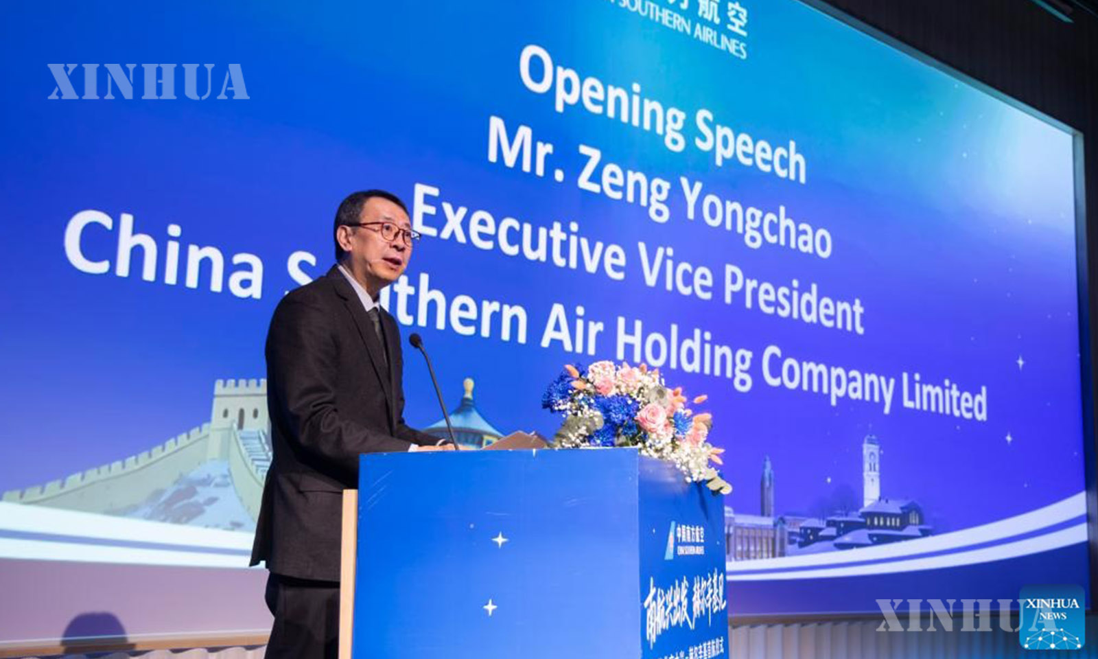 Zeng Yongchao, executive vice president of China Southern Air Holding Company, speaks at a promotion event hosted by China Southern Airlines for the new Beijing-Helsinki direct route in Helsinki, Finland, March 30, 2026. (Photo by Matti Matikainen/Xinhua)