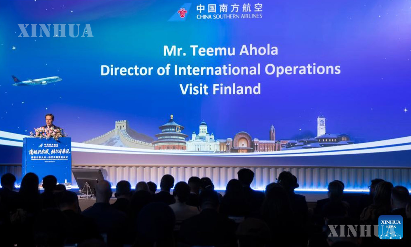 ပေကျင်း-ဟယ်ဆင်ကီ တိုက်ရိုက်လမ်းကြောင်းသစ်အတွက် China Southern လေကြောင်းလိုင်းမှ ဖင်လန်နိုင်ငံ မြို့တော်ဟယ်ဆင်ကီတွင် ကျင်းပသည့် အရောင်းမြှင့်တင်ရေးအခမ်းအနား၌ Visit Finland အဖွဲ့၏ နိုင်ငံတကာလုပ်ငန်းလည်ပတ်မှုဒါရိုက်တာ Teemu Ahola က အမှတ်တရစကားပြောကြားနေသည်ကို ၂၀၂၆ ခုနှစ် မတ် ၃၀ ရက်က တွေ့ရစဉ် (ဆင်ဟွာ)