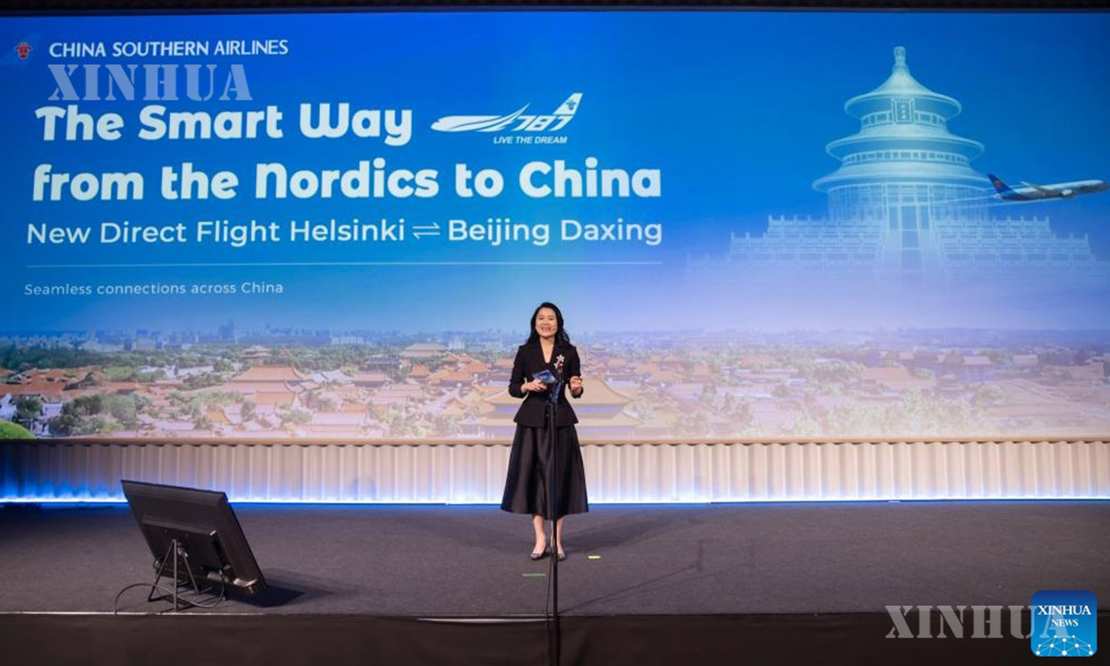A staff member introduces the new Beijing-Helsinki direct route at a promotion event hosted by China Southern Airlines in Helsinki, Finland, March 30, 2026. (Photo by Matti Matikainen/Xinhua)