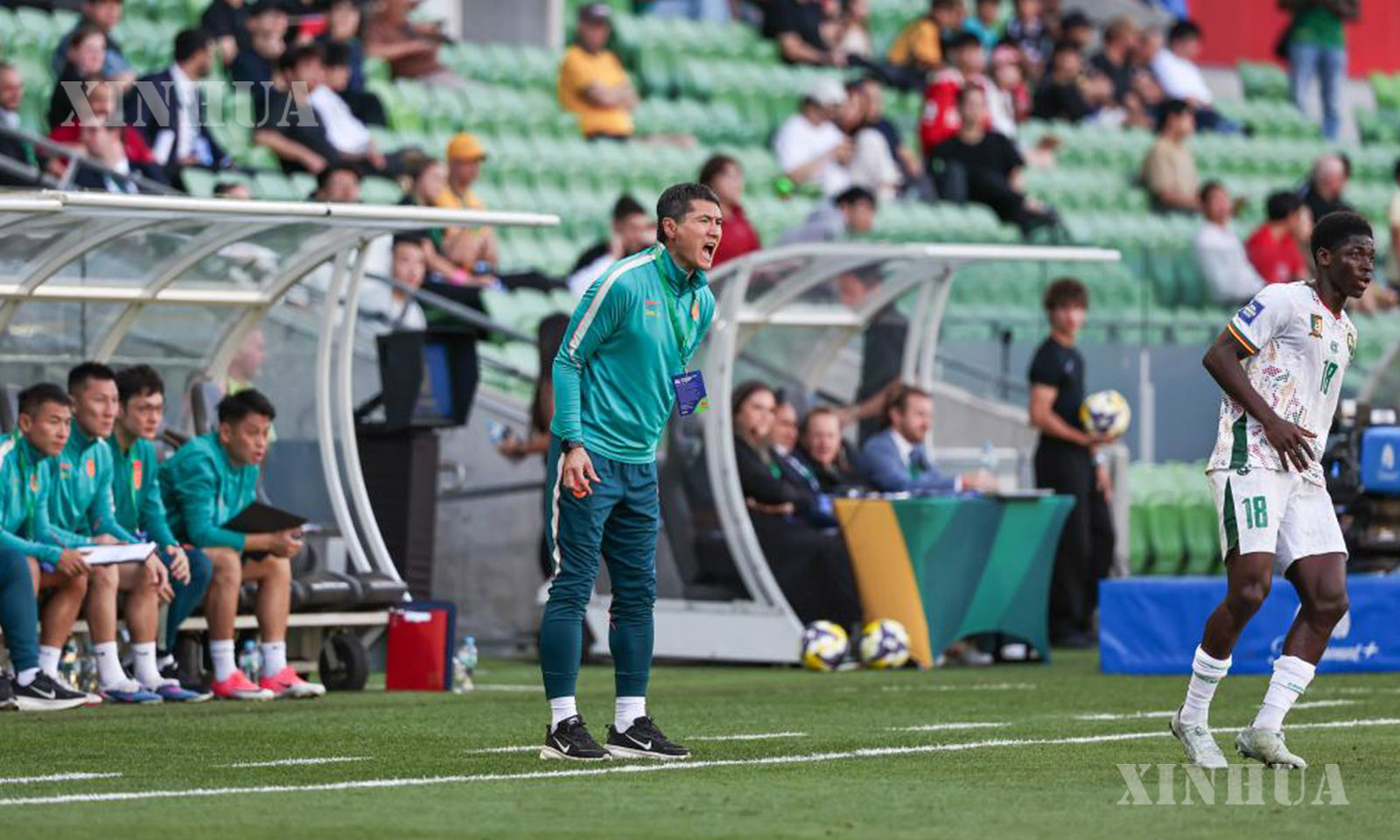 ဩစတြေးလျနိုင်ငံ မဲလ်ဘုန်းမြို့တွင် ၂၀၂၆ ခုနှစ် မတ် ၃၁ ရက်က ယှဉ်ပြိုင်ကစားသည့် ၂၀၂၆ ဖီဖာ စီးရီးစ် နိုင်ငံတကာချစ်ကြည်ရေး ဘောလုံးပွဲစဉ်၌ နည်းပြချုပ် ရှောက်ကျားရီး ကွင်းဘေးမှ ညွှန်ကြားနေစဉ် (ဆင်ဟွာ)