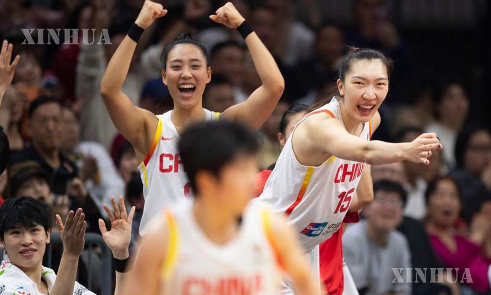တရုတ်နိုင်ငံ အလယ်ပိုင်း ဟူပေပြည်နယ် ဝူဟန့်မြို့တွင် FIBA အမျိုးသမီးကမ္ဘာ့ဖလား လက်ရည်စစ်ပွဲ အုပ်စု-A ပွဲစဉ်အဖြစ် တရုတ်အသင်းနှင့် တောင်ဆူဒန်အသင်းတို့ ယှဉ်ပြိုင်ကစားသည့် ပွဲစဉ်၌ တရုတ်အသင်းမှ ချန်ယွိကျယ် ရမှတ်ရယူနိုင်ပြီးနောက် အသင်းဖော်များဖြစ်သည့် ဟန်ရွှိ (ယာ) နှင့် ထန်ကျစ်ထျင်တို့ အောင်ပွဲခံနေပုံကို ၂၀၂၆ ခုနှစ် မတ် ၁၄ ရက်က တွေ့ရစဉ် (ဆင်ဟွာ)