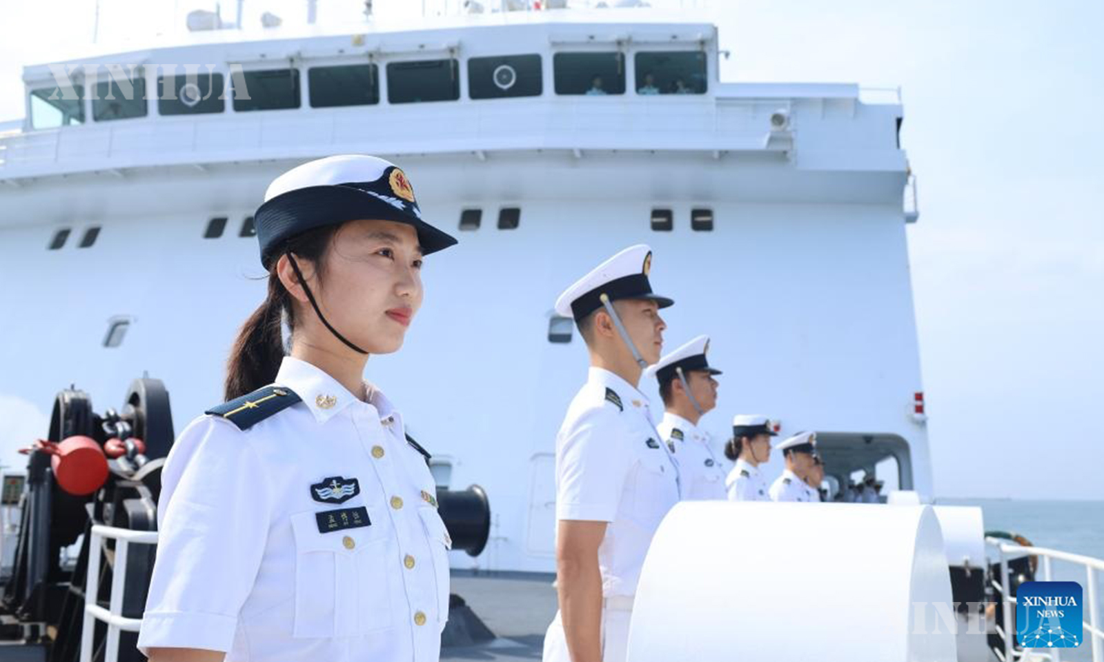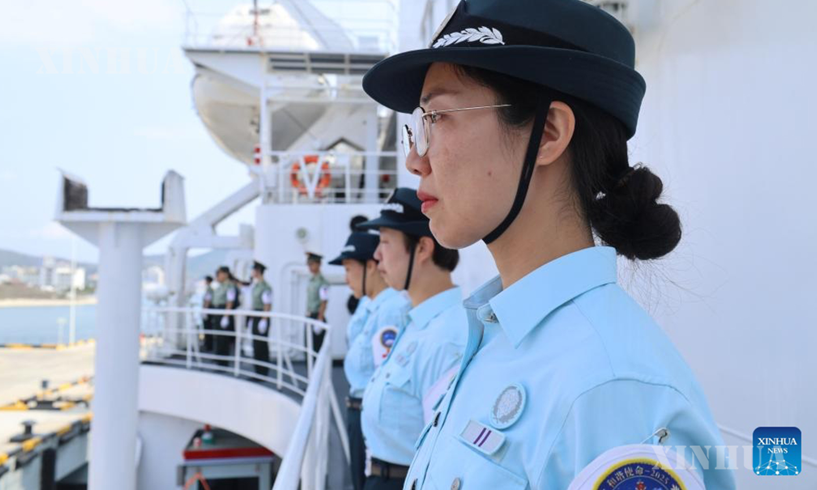 တရုတ်နိုင်ငံ တောင်ပိုင်း ဟိုင်နန်ပြည်နယ် ဆန်းရမြို့ရှိ စစ်ဘက်ဆိပ်ကမ်းတစ်ခု၌ ဆိုက်ကပ်ရပ်နားထားသော တရုတ်ပြည်သူ့လွတ်မြောက်ရေးတပ်မတော် (PLA) ရေတပ်၏ ဆေးရုံသင်္ဘော Silk Road Ark ပေါ်တွင် အမှုထမ်းများ စုဖွဲ့နေရာယူထားပုံကို ၂၀၂၆ ခုနှစ် ဧပြီ ၂၆ ရက်က တွေ့ရစဉ် (ဆင်ဟွာ)