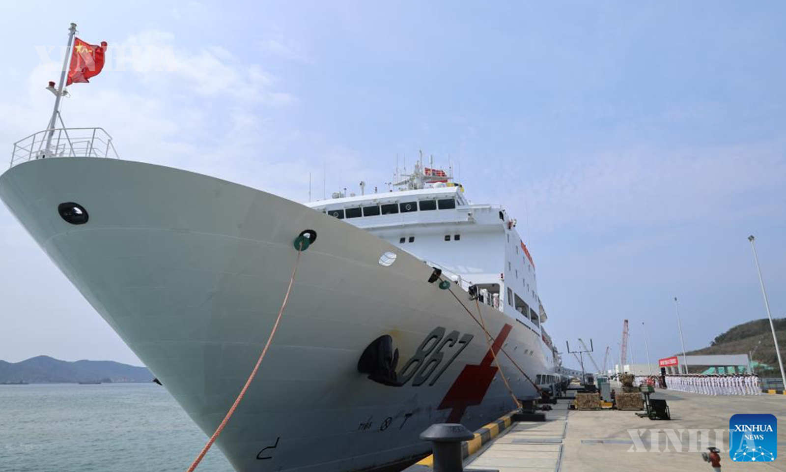 This photo taken on April 26, 2026 shows a welcoming ceremony held for the Chinese People’s Liberation Army (PLA) Navy hospital ship, Silk Road Ark, at a military port in Sanya, south China’s Hainan Province. (Photo by Cui Xiaoyang/Xinhua)