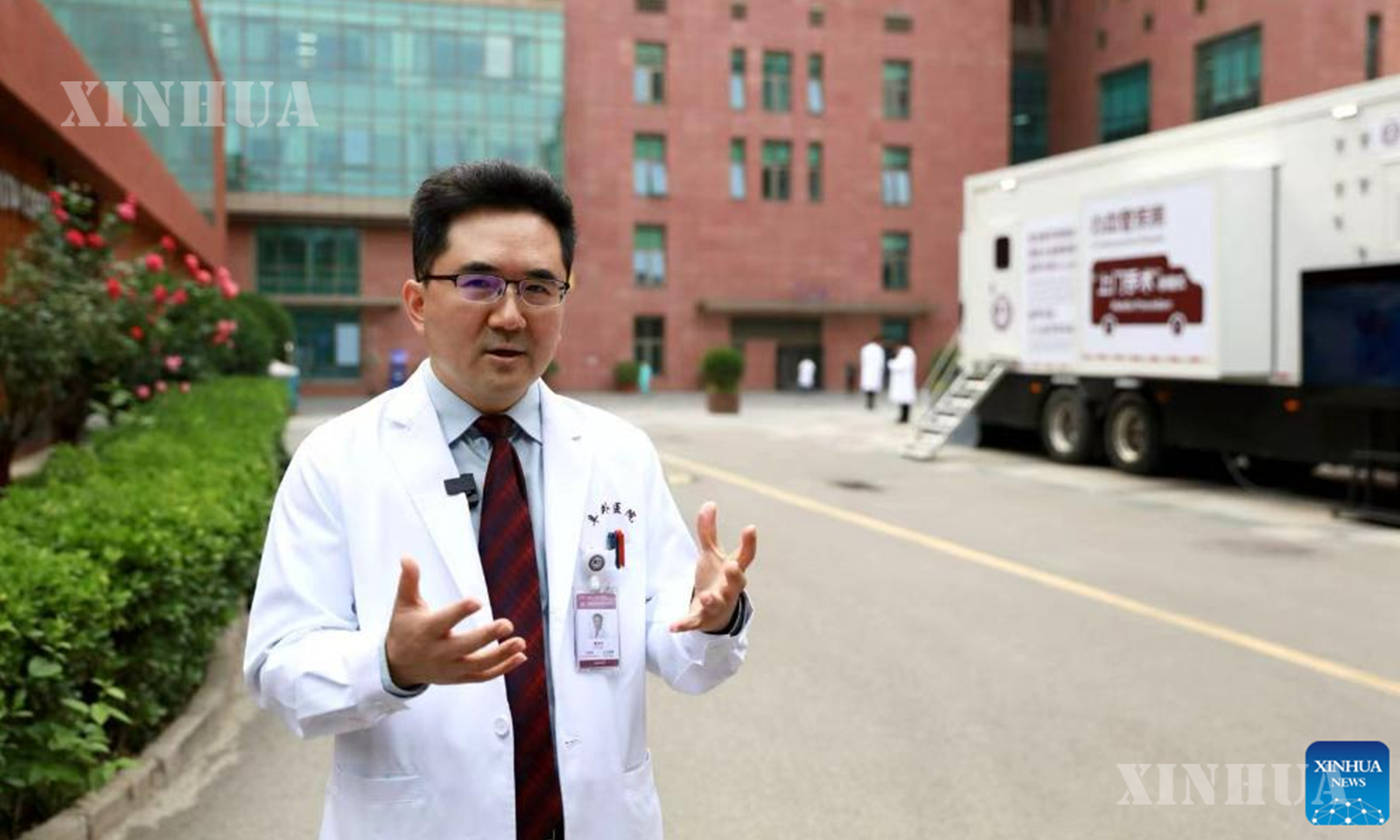 Pan Xiangbin, vice president and professor of the Beijing-based Fuwai Hospital, Chinese Academy of Medical Sciences, introduces a mobile operation vehicle of his hospital in Beijing, capital of China, May 18, 2025.(Xinhua/Fang Sixian)