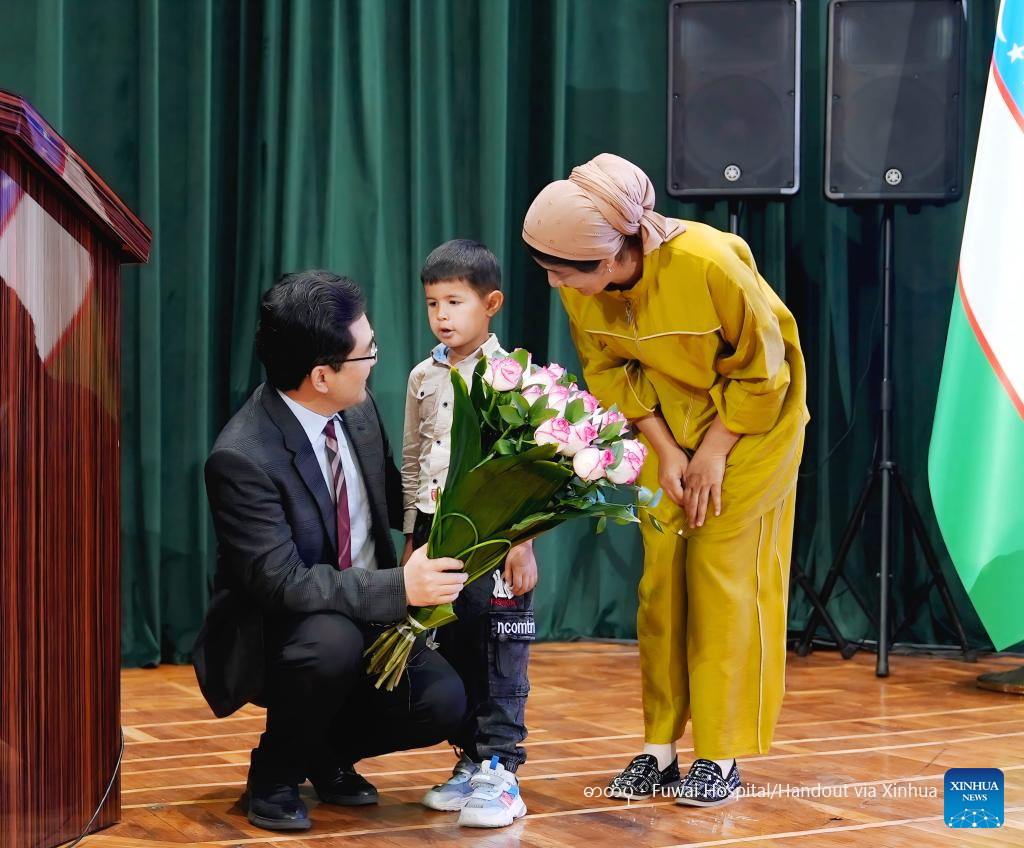 Aziz and his mother present flowers to express their gratitude to Pan Xiangbin, vice president and professor of the Beijing-based Fuwai Hospital, Chinese Academy of Medical Sciences, in Tashkent, Uzbekistan, May 1, 2025. (Fuwai Hospital/Handout via Xinhua)