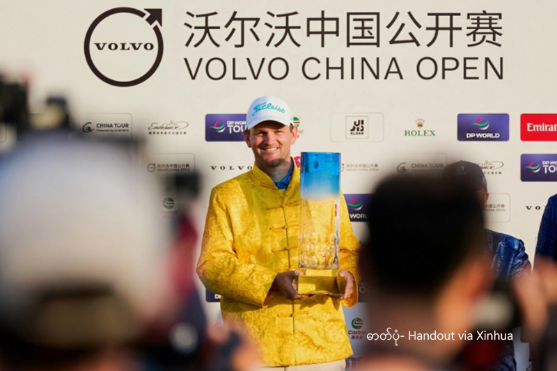 Volvo China Open ချန်ပီယံ ဩစတြီးယား ဂေါက်သီးရိုက်အားကစားသမား ဘန်းဒ် ဝေးစ်ဘာဂါ အမှတ်တရဓာတ်ပုံရိုက်နေသည်ကို ၂၀၂၆ ခုနှစ် ဧပြီ ၂၆ ရက်က တွေ့ရစဉ် (ဓာတ်ပုံ- Handout via Xinhua)