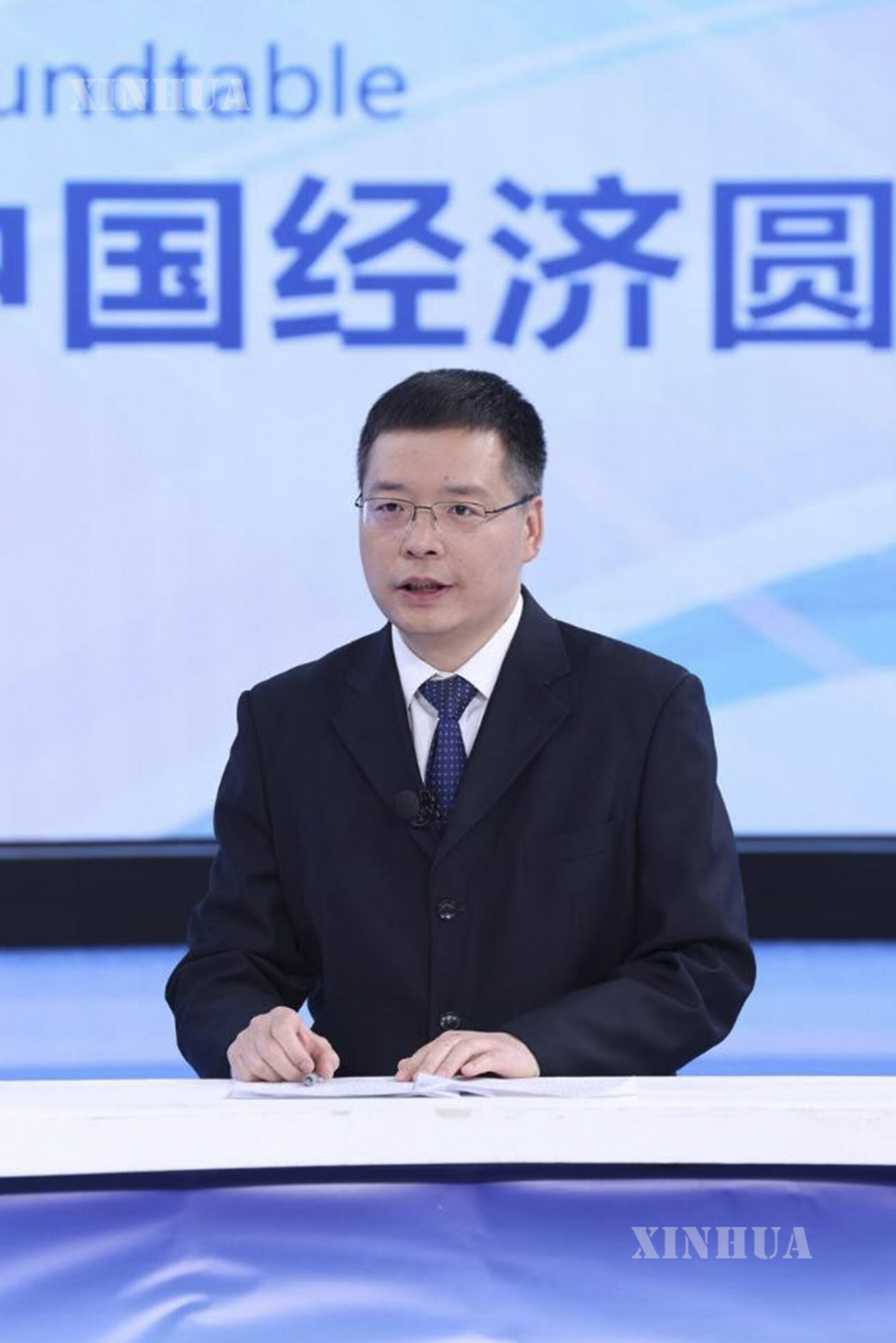 Zhai Tianrui, deputy director of Beijing Municipal Science and Technology Commission and the Administrative Commission of Zhongguancun Science Park, speaks at the recording site of the 29th episode of the China Economic Roundtable, an all-media talk show hosted by Xinhua News Agency. (Xinhua/Yin Gang)
