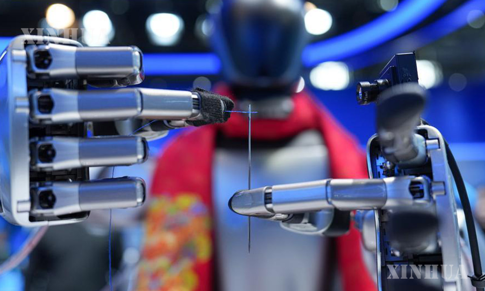 A robot shows its function of needle threading at the permanent exhibition at the Zhongguancun Exhibition Center in Beijing, capital of China, March 25, 2026. (Xinhua/Ju Huanzong)