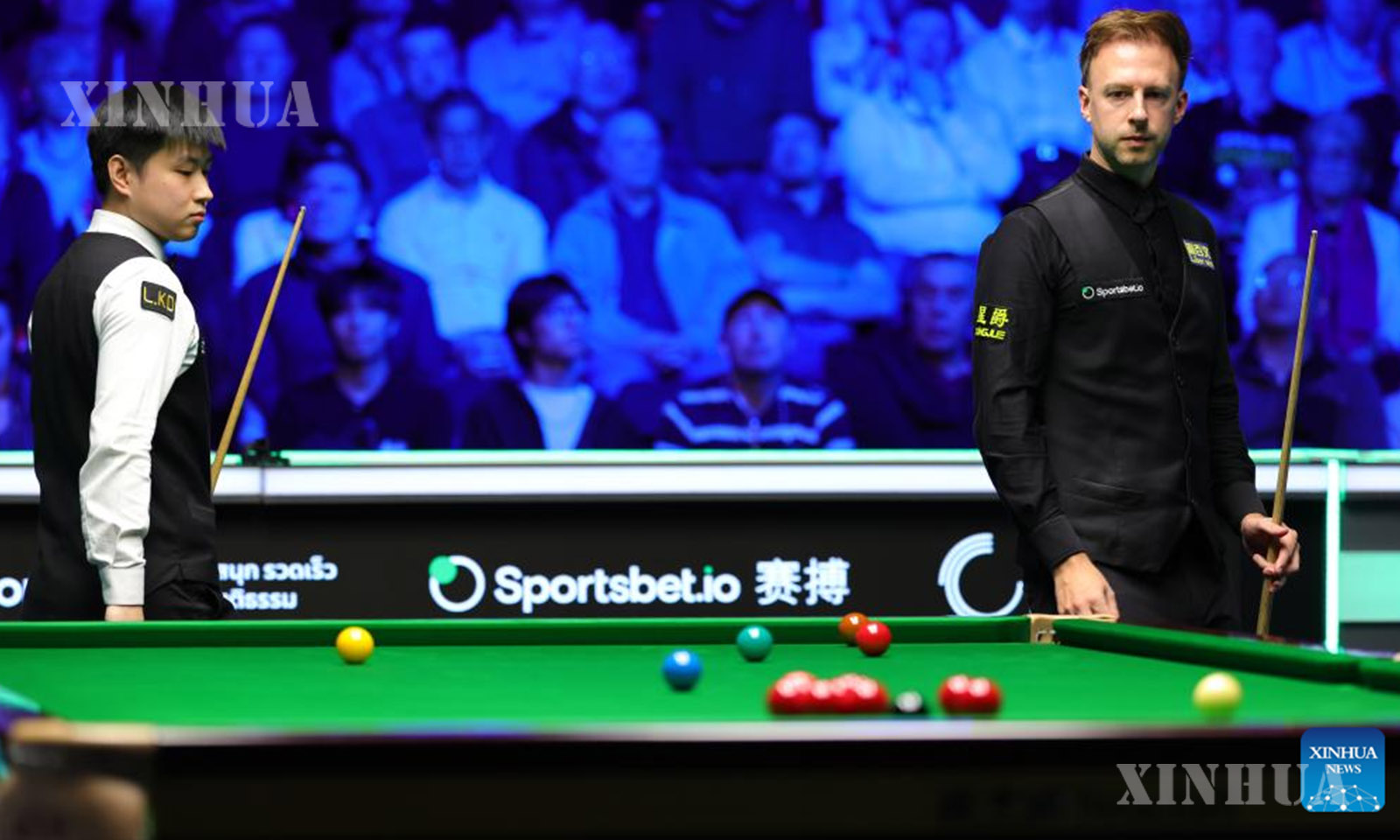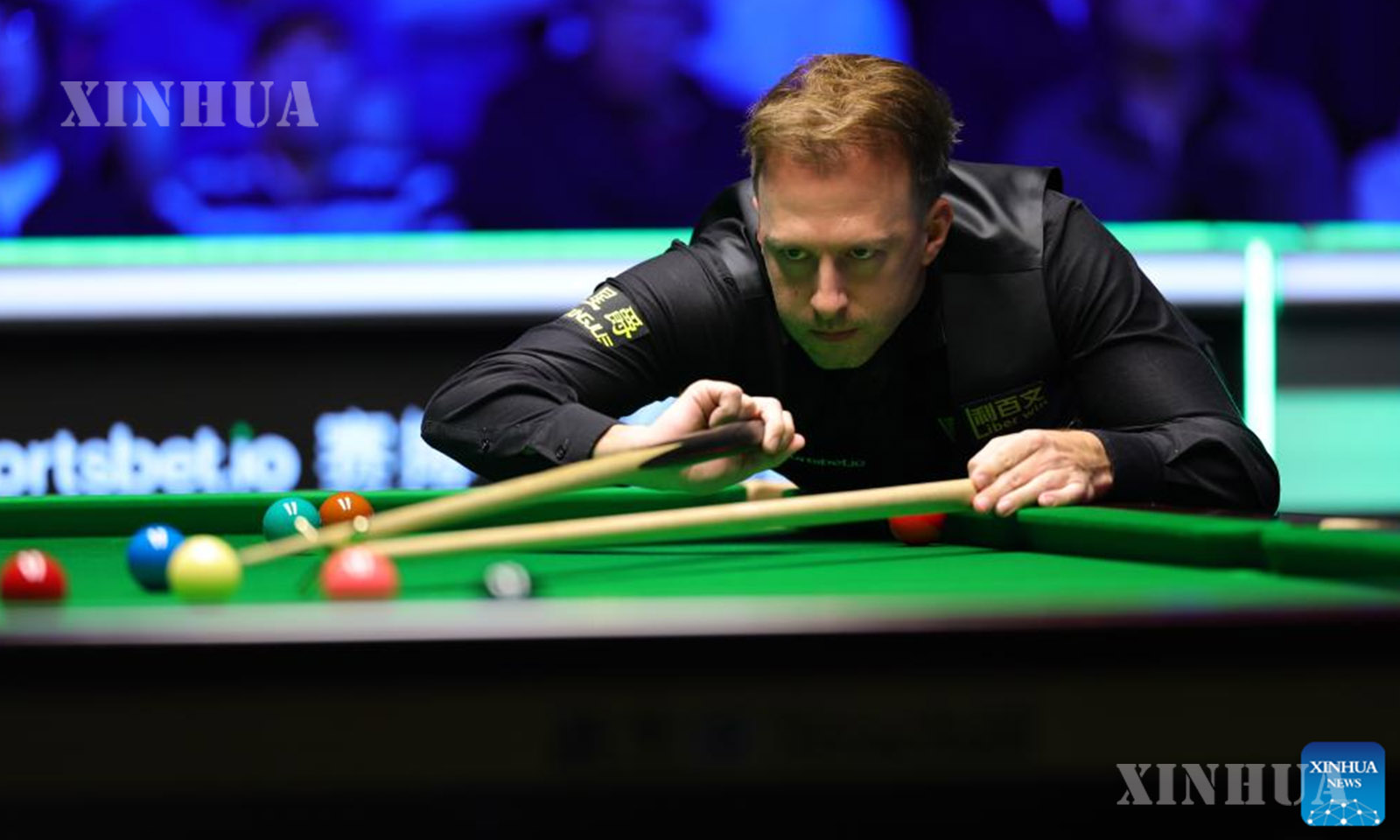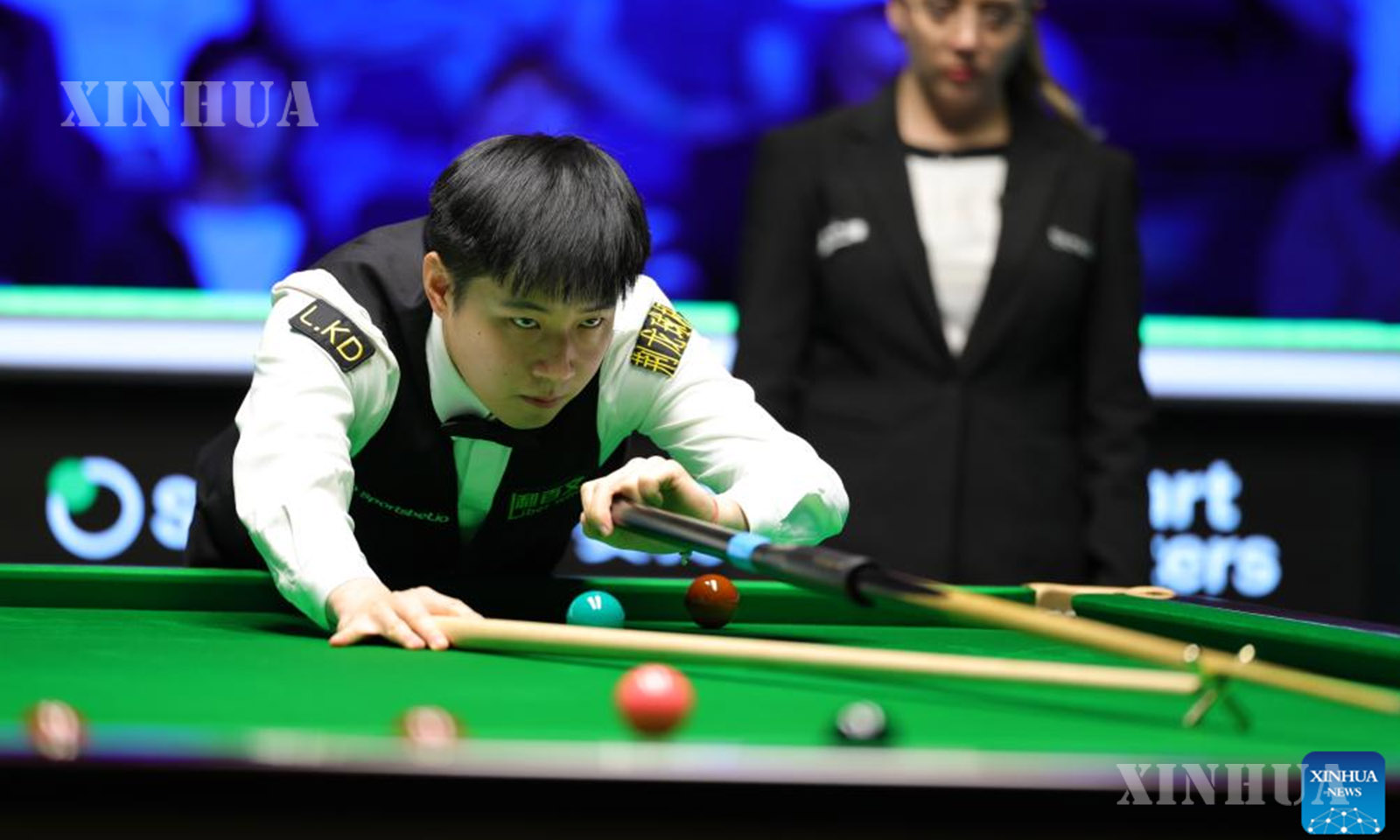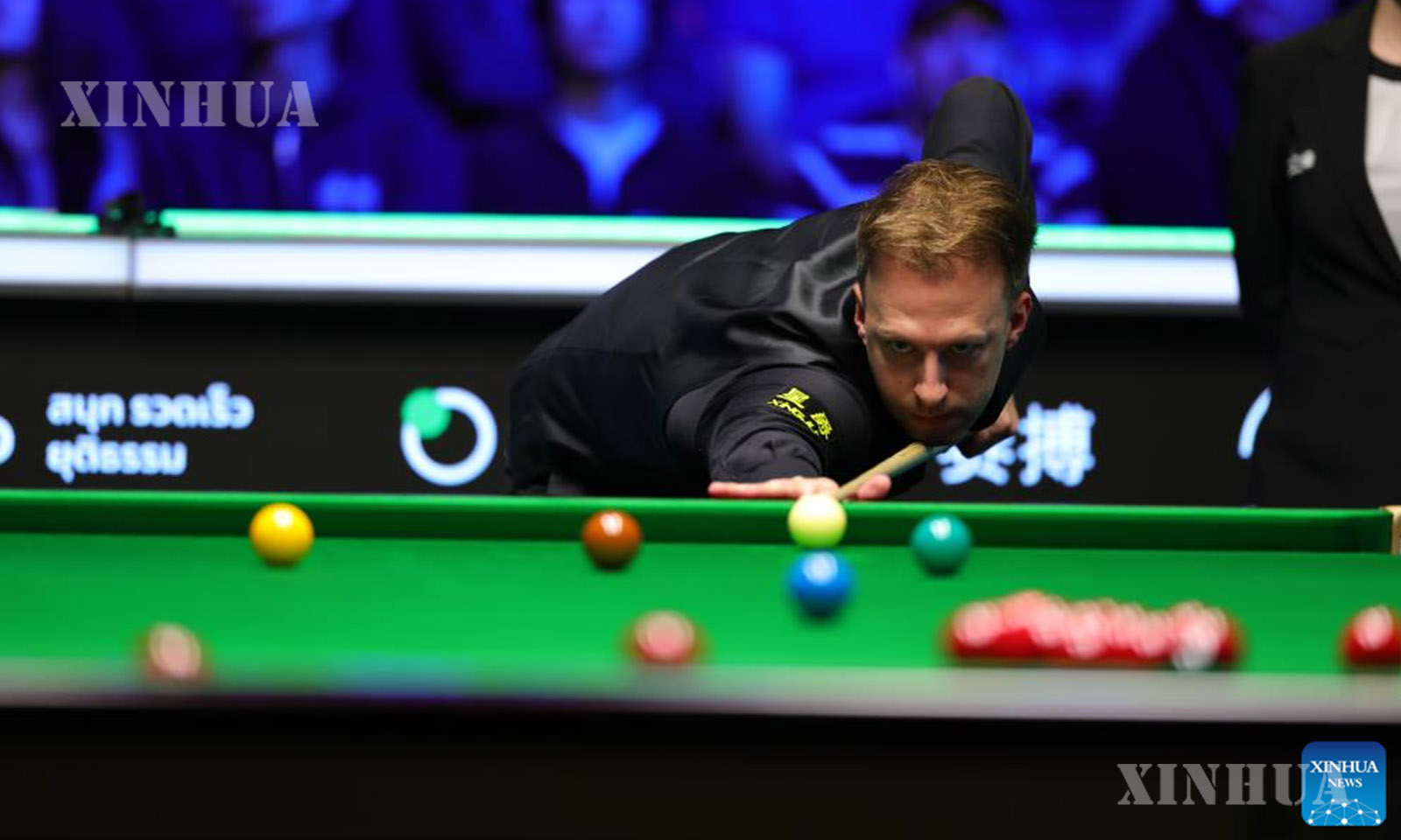 ဗြိတိန်နိုင်ငံ မန်ချက်စတာမြို့တွင် ကျင်းပသည့် ၂၀၂၆ ခုနှစ် Snooker Tour Championship ပြိုင်ပွဲ၌ တရုတ်နိုင်ငံမှ ကျောက်ရှင်းထုန်နှင့် အင်္ဂလန်နိုင်ငံမှ ဂျက်ဒ်ထရမ့်၏ ဗိုလ်လုပွဲအတွင်း ပါဝင်ယှဉ်ပြိုင်နေသည့် အင်္ဂလန်နိုင်ငံမှ ဂျက်ဒ်ထရမ့်ကို ၂၀၂၆ ခုနှစ် ဧပြီ ၅ ရက်က တွေ့ရစဉ် (ဆင်ဟွာ)