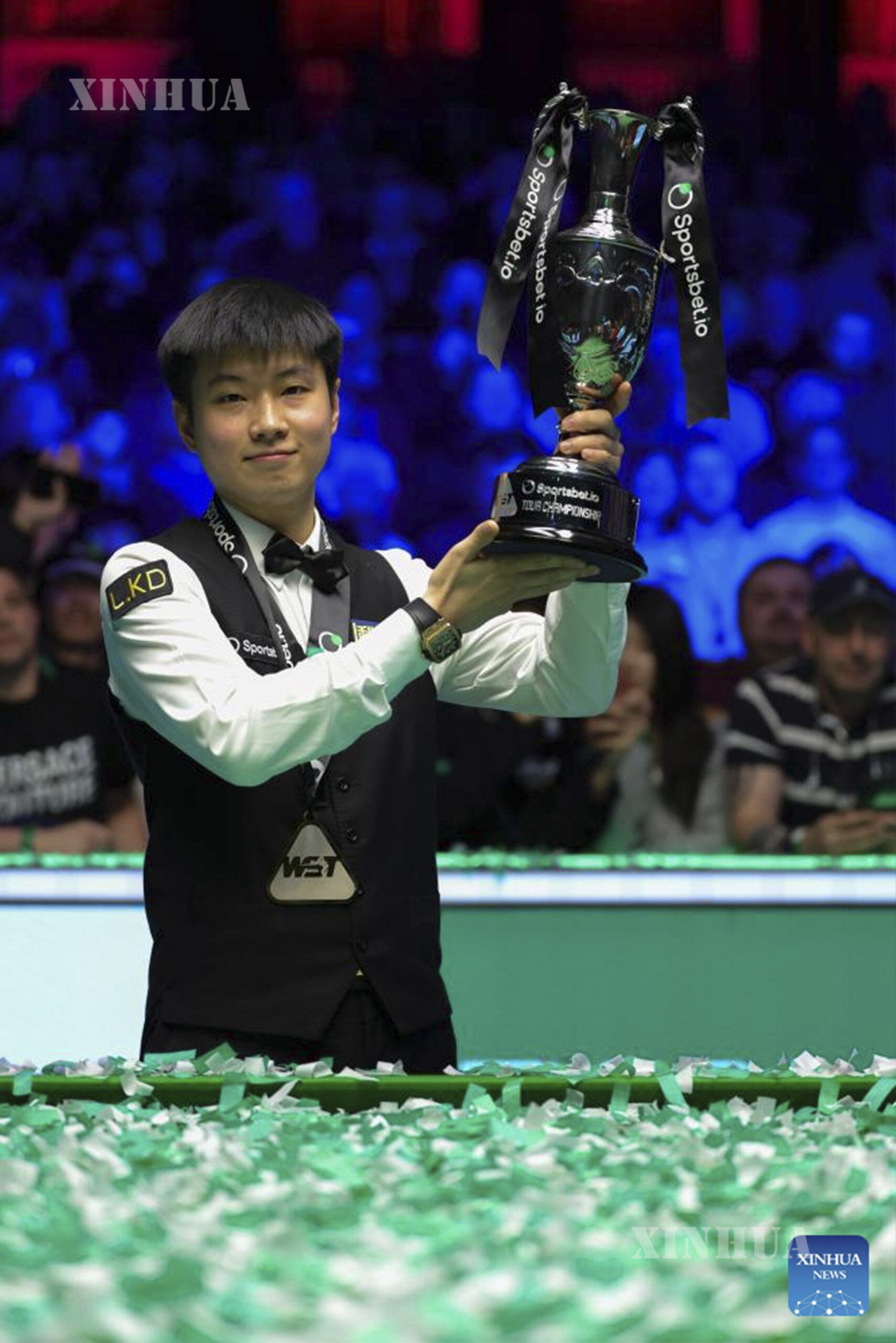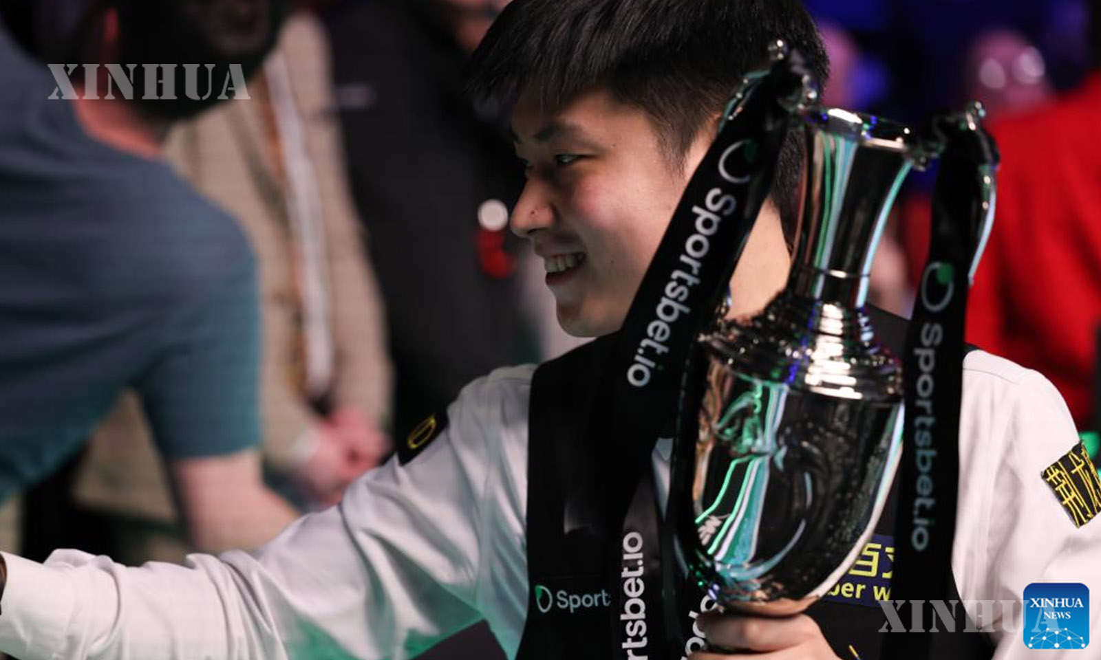 Zhao Xintong of China poses with his trophy during the awarding ceremony after the final between Zhao Xintong of China and Judd Trump of England at the 2026 Snooker Tour Championship in Manchester, Britain, April 5, 2026. (Photo by Zhai Zheng/Xinhua)