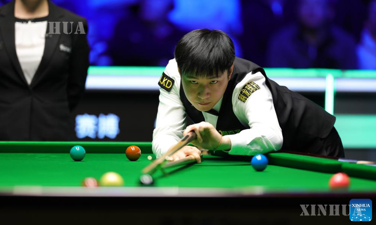 Zhao Xintong (C) of China competes during the final between Zhao Xintong of China and Judd Trump of England at the 2026 Snooker Tour Championship in Manchester, Britain, April 5, 2026. (Photo by Zhai Zheng/Xinhua)