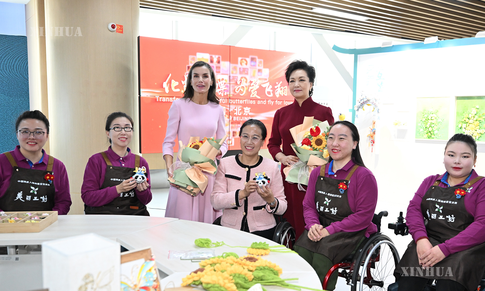 ဖုန်လိယွမ်နှင့် စပိန်နိုင်ငံ မိဖုရား လဲတီဇီးယားတို့ ပေကျင်းမြို့ မသန်စွမ်းသူများ ဝန်ဆောင်မှု သရုပ်ပြစင်တာအား သွားရောက်လေ့လာကြည့်ရှု
