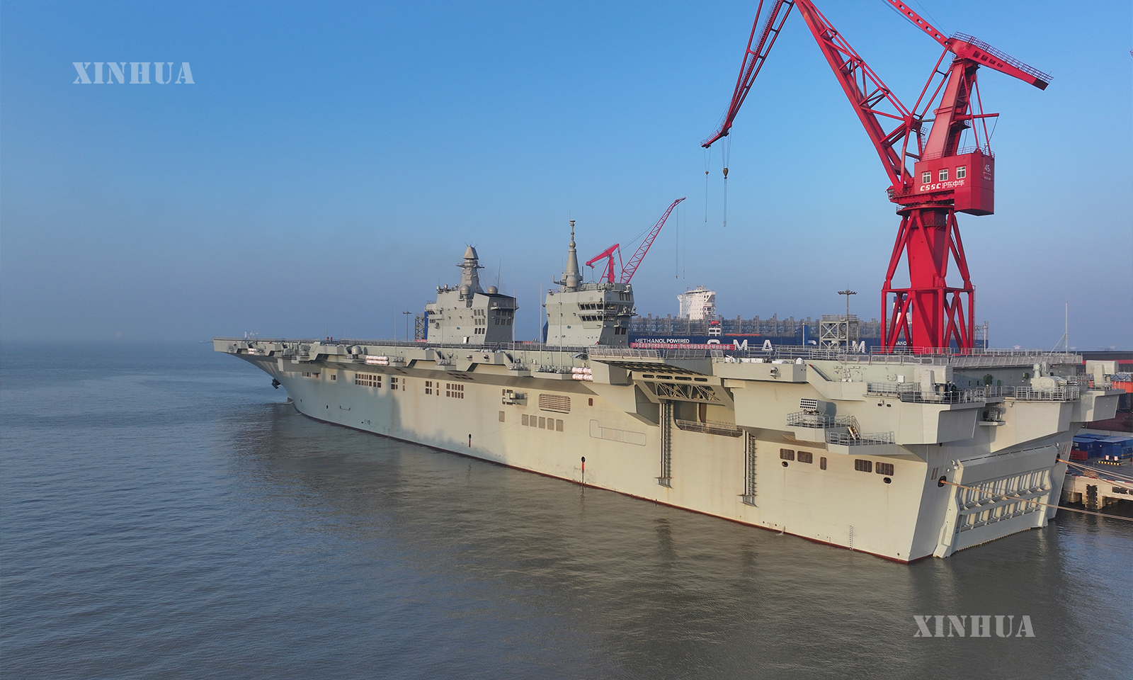 图说:11月14日9时许,我国076两栖攻击舰首舰四川舰从上海沪东中华造船厂码头解缆启航,赴相关海域开展首次航行试验任务。华社发(张良 摄)