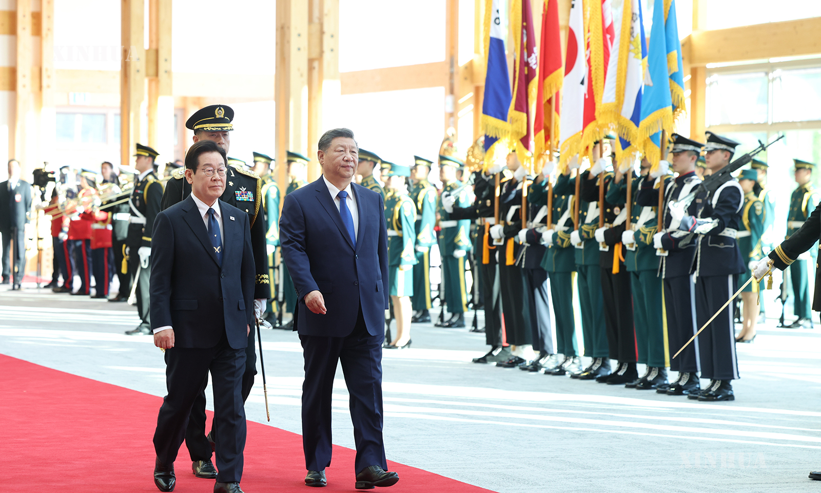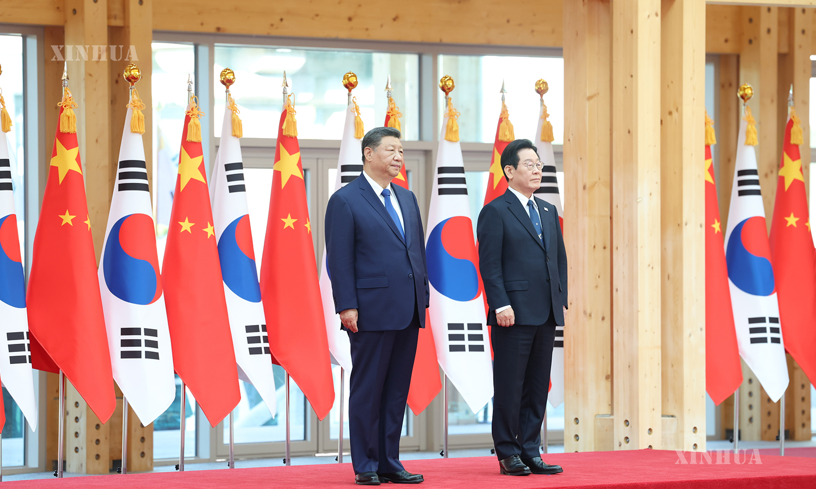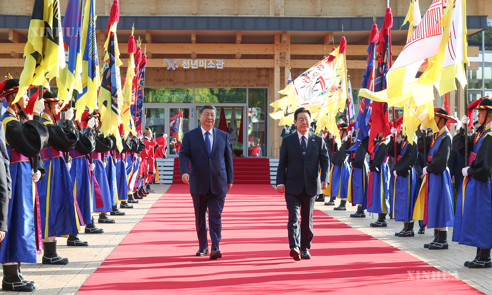 တောင်ကိုရီးယားသမ္မတ လီဂျေမြောင်သည် တရုတ်နိုင်ငံသမ္မတ ရှီကျင့်ဖိန်နှင့်အတူ ဂယောင်းဂျူပြတိုက်၌ ဒေသစံတော်ချိန် နိုဝင်ဘာ ၁ ရက် ညနေပိုင်းတွင် တွေ့ဆုံဆွေးနွေးမှုပြုလုပ်ခဲ့ရာ နှစ်နိုင်ငံ ခေါင်းဆောင်များ စစ်ဆေးကြည့်ရှုသည့် စင်မြင့်ပေါ်သို့ တက်ရောက်နေစဉ် (ဆင်ဟွာ)