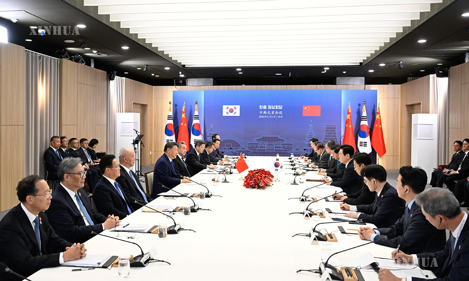တောင်ကိုရီးယားနိုင်ငံသမ္မတ လီဂျေမြောင်သည် တရုတ်နိုင်ငံသမ္မတ ရှီကျင့်ဖိန်နှင့် ဂယောင်းဂျူပြတိုက်၌ ဒေသစံတော်ချိန် နိုဝင်ဘာ ၁ ရက် ညနေပိုင်းတွင် တွေ့ဆုံဆွေးနွေးခဲ့သည်။နိုဝင်ဘာလတွင် ဂယောင်းဂျူမြို့သည် ဆောင်းဦးရာသီ အငွေ့အသက်များနှင့် ပြည့်နှက်နေပေသည်။ သမ္မတ ရှီကျင့်ဖိန် ယာဉ်ပေါ်မှ ဆင်းသက်လာချိန်တွင် တောင်ကိုရီးယားဂုဏ်ပြုတပ်ဖွဲ့က ခမ်းနားထည်ဝါစွာ ကြိုဆိုခဲ့သည်။