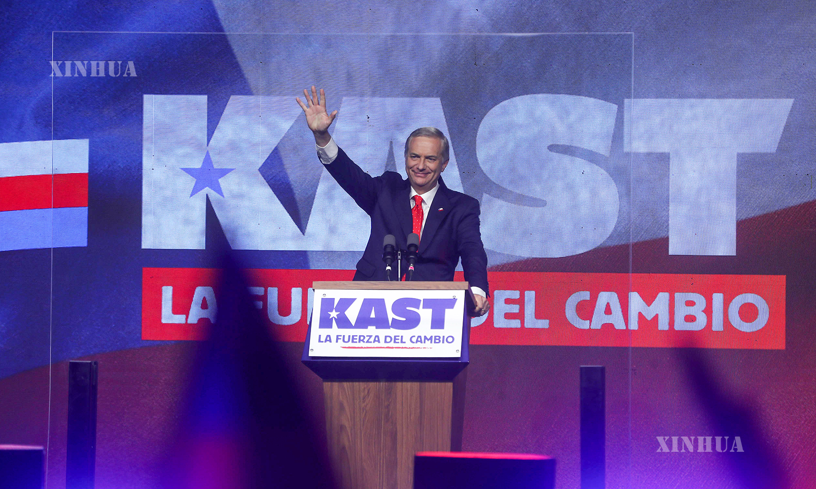 图说:这是11月16日,在智利首都圣地亚哥,何塞·安东尼奥·卡斯特在确定进入总统选举第二轮投票后发表讲话。 新华社发