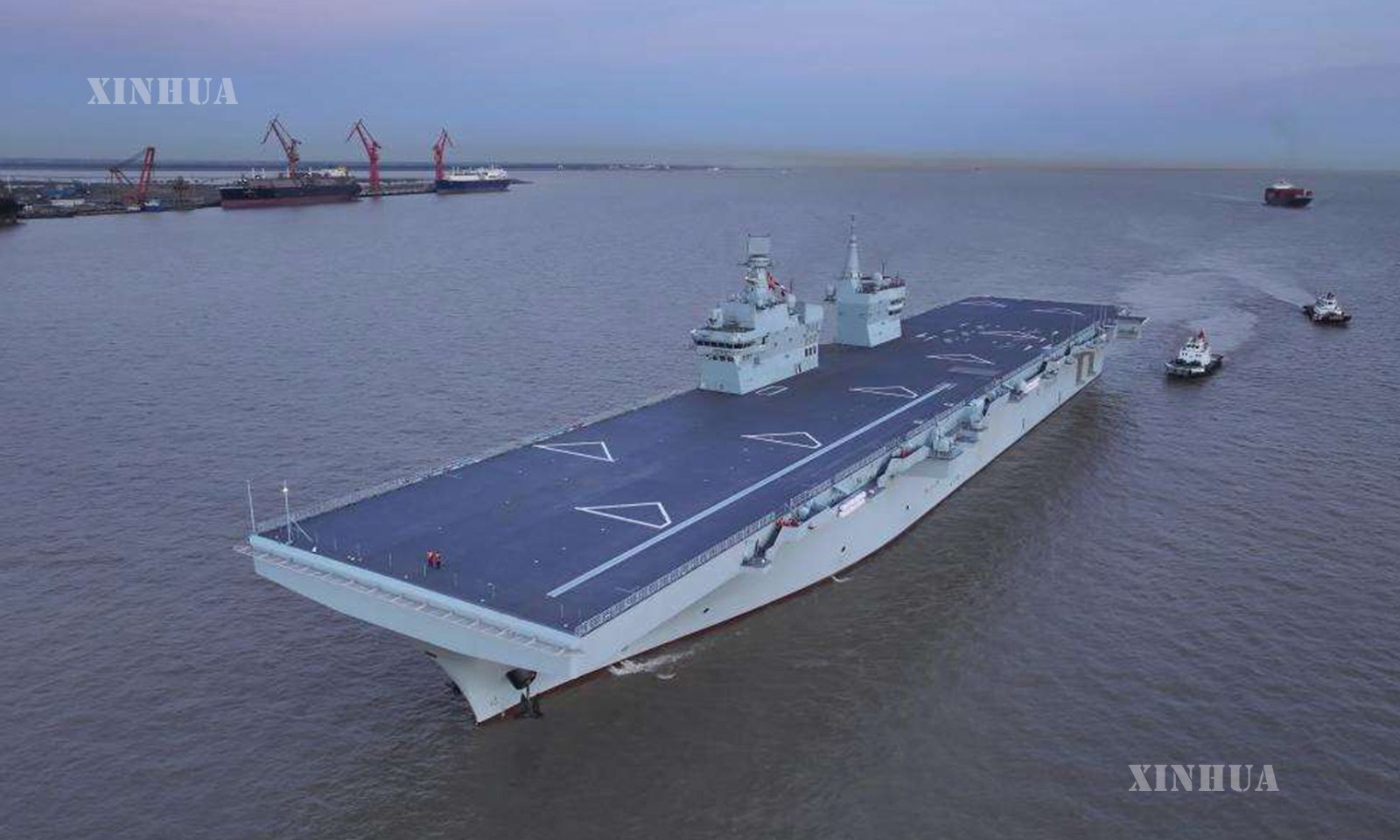 တရုတ်နိုင်ငံ၏ ပထမဆုံး ကုန်းရေနှစ်သွယ်တိုက်ခိုက်ရေးသင်္ဘော Type 076 စီချွမ်းသင်္ဘော၏ ရေကြောင်းခရီးစမ်းသပ်မှုတာဝန်ပြီးဆုံးပြီးနောက် သင်္ဘောကျင်းဆိပ်ကမ်းသို့ ပြန်လာနေသည်ကို ၂၀၂၅ ခုနှစ် နိုဝင်ဘာ ၁၆ ရက်က တွေ့ရစဥ် (ဆင်ဟွာ)