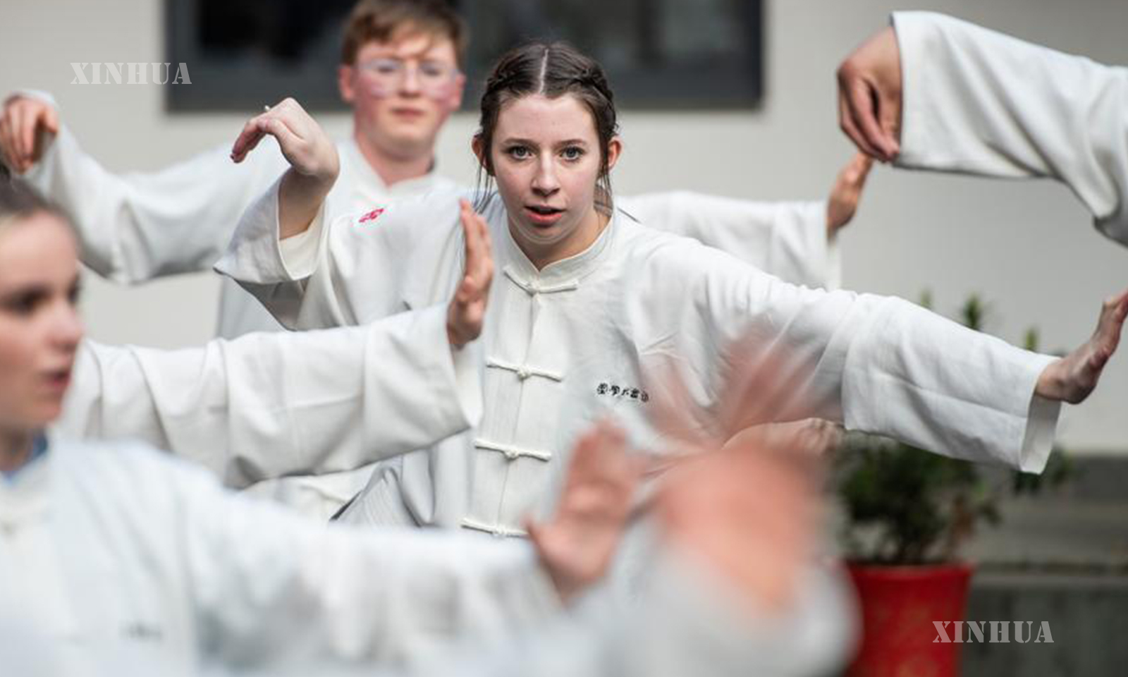 တရုတ်နိုင်ငံ အလယ်ပိုင်း ဟူပေပြည်နယ်ရှိ တာအို ကိုယ်ခံပညာရပ် လေ့လာဆည်းပူးရာ နေရာဖြစ်သည့် ဝူတန်းတောင်ပေါ်၌ အမေရိကန်နိုင်ငံ ဝါရှင်တန်ပြည်နယ်မှ အထက်တန်းကျောင်းသား၊ကျောင်းသူ ကိုယ်စားလှယ်အဖွဲ့မှ အဖွဲ့ဝင်များ ထိုက်ချိသိုင်းလေ့ကျင့်နေပုံကို ၂၀၂၄ ခုနှစ် မတ် ၂၂ ရက်က တွေ့ရစဉ် (ဆင်ဟွာ)