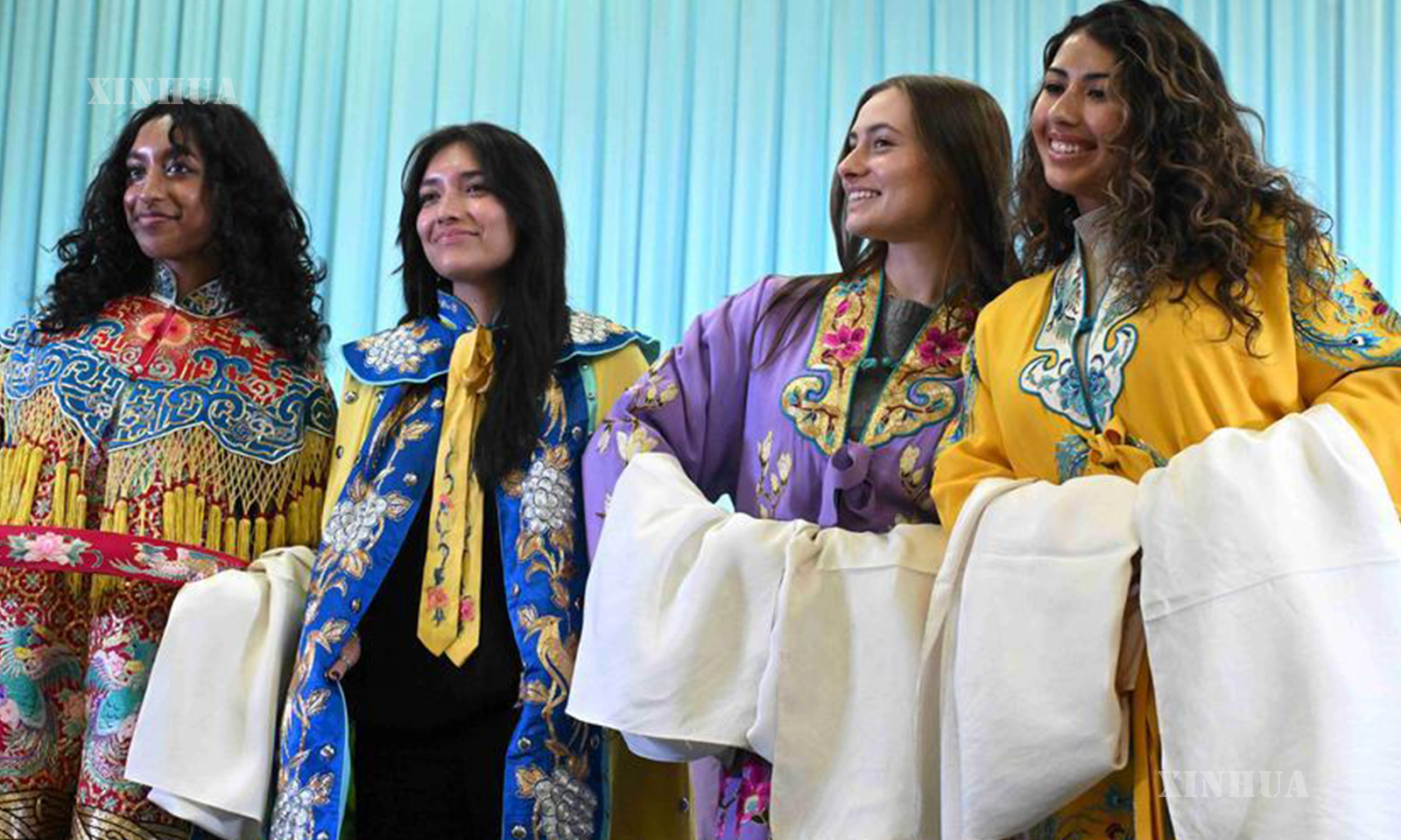 တရုတ်နိုင်ငံ မြောက်ပိုင်း ဟဲပေပြည်နယ် ရှီးကျားကျွမ်းမြို့တွင် ပီကင်းအော်ပရာပြဇာတ် ဝတ်စုံများဖြင့် အမှတ်တရဓာတ်ပုံရိုက်နေသည့် အမေရိကန် ကောလိပ်ကျောင်းသူများအား ၂၀၂၄ ခုနှစ် ဒီဇင်ဘာ ၃၀ ရက်က တွေ့ရစဉ် (ဆင်ဟွာ)