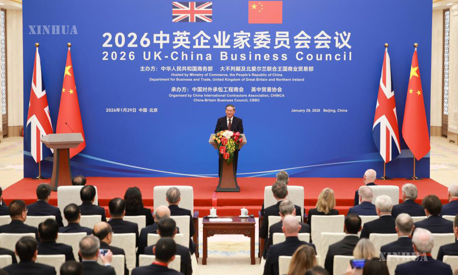 Chinese Premier Li Qiang delivers a speech at the closing ceremony of the 2026 UK-China Business Council meeting at the Great Hall of the People in Beijing, capital of China, on Jan. 29, 2026. (Xinhua/Huang Jingwen)