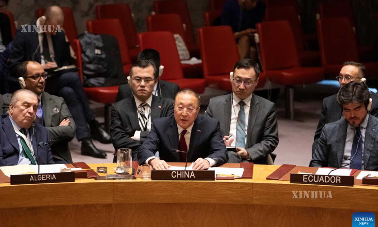 Zhang Jun (C, Front), China’s permanent representative to the United Nations (UN), speaks at a Security Council meeting on the Ukraine crisis, at the UN headquarters in New York, on Feb. 23, 2024. (Xinhua/Xie E)