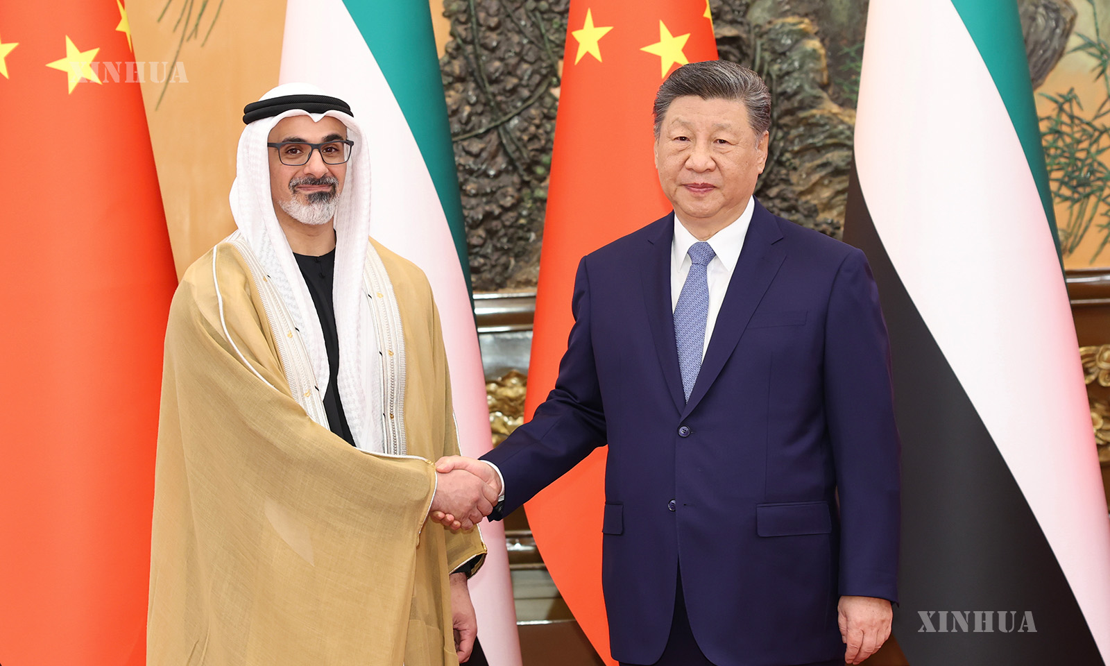 တရုတ်နိုင်ငံ သမ္မတ ရှီကျင့်ဖိန်က ပေကျင်းမြို့တွင် အာရပ်စော်ဘွားများပြည်ထောင်စု (ယူအေအီး) အဘူဒါဘီ အိမ်ရှေ့မင်းသား ရှိတ်ခါလက် ဘင်မိုဟာမက် ဘင်ဇာယက်ဒ် အယ်လ်နာယန်နှင့် တွေ့ဆုံစဉ် အရှေ့အလယ်ပိုင်းဒေသ တည်ငြိမ်အေးချမ်းမှု မြှင့်တင်ရေးအတွက် အချက်လေးချက်ပါဝင်သော အဆိုပြုချက်ကို ဧပြီ ၁၄ ရက်၌ အဆိုပြုပြောကြားခဲ့သည်။ ရှီက ငြိမ်းချမ်းစွာအတူယှဉ်တွဲနေထိုင်ရေးမူဝါဒကို လက်ကိုင်ပြုကျင့်သုံးရန် တိုက်တွန်းပြောကြားခဲ့ပြီး အရှေ့အလယ်ပိုင်းနှင့် ပါရှန်ပင်လယ်ကွေ့ဒေသ၌ ဘုံတူညီ၍ ကျယ်ကျယ်ပြန့်ပြန့်ရှိသော၊ ပူးပေါင်းဆောင်ရွက်မှုရှိ၍ ရေရှည်တည်တံ့သော လုံခြုံရေးအခင်းအကျင်းတစ်ခု ဖော်ဆောင်မှုကို အားပေးမြှင့်တင်ရန် အရေးကြီးကြောင်း မှတ်ချက်ပြုခဲ့သည်။