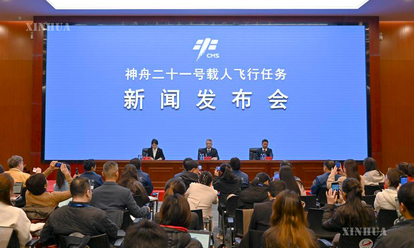 A press conference on the Shenzhou-21 crewed spaceflight mission is held in Jiuquan Satellite Launch Center in northwest China on Oct. 30, 2025. (Xinhua/Li Zhipeng)