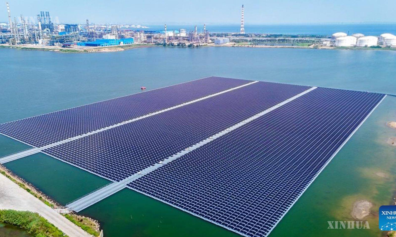 An aerial drone photo taken on July 4, 2025 shows a floating offshore photovoltaic (PV) project of Sinopec Qingdao Refining & Chemical Co., Ltd. in a full-seawater environment in Qingdao, east China’s Shandong Province. (Photo by Zhang Jingang/Xinhua)