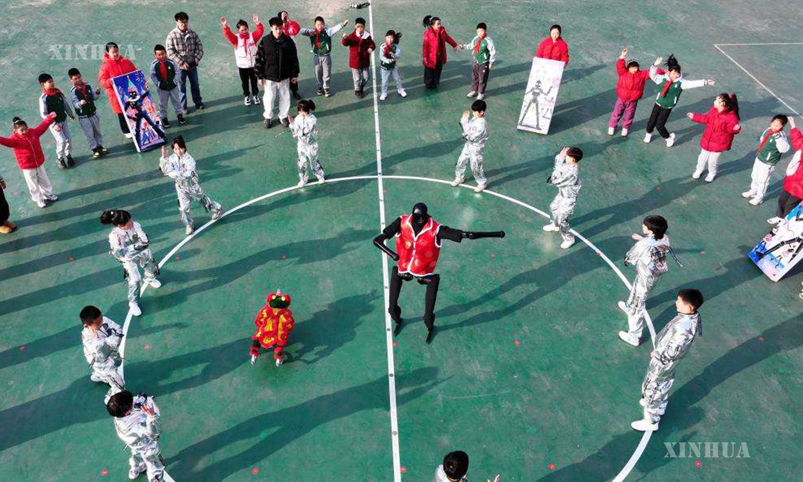 An aerial drone photo shows students dancing with an intelligent robot dog and a humanoid robot at a primary school in Wuhan, central China’s Hubei Province, Feb. 13, 2025. (Photo by Zhao Jun/Xinhua)