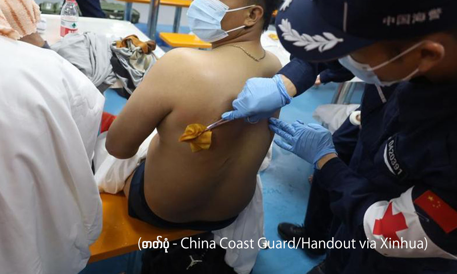 တရုတ်နိုင်ငံ တောင်ပိုင်း ဟွမ်ရန်သောင်ကျွန်းရှိ ပိုင်နက်ရေပြင်တွင် နိုင်ငံခြားကုန်တင်သင်္ဘောတစ်စင်း နစ်မြုပ်ပြီးနောက် ကယ်တင်ထားသည့် ဖိလစ်ပိုင်သင်္ဘောသားတစ်ဦးကို ဆေးကုသပေးနေသည့် တရုတ်ကမ်းခြေစောင့်တပ်ဖွဲ့ဝင်တစ်ဦးကို ၂၀၂၆ ခုနှစ် ဇန်နဝါရီ ၂၃ ရက်က တွေ့ရစဉ် (ဓာတ်ပုံ – China Coast Guard/Handout via Xinhua)