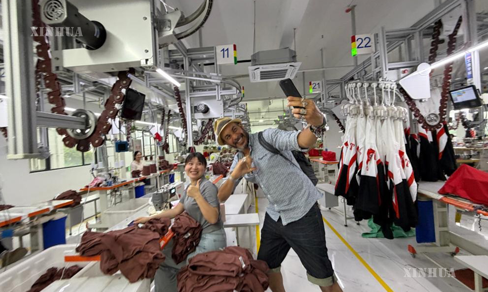 This photo taken with a mobile phone shows Egyptian adventurer and world traveler Ahmed Haggagovic (R) taking a selfie with a worker at an export-trade clothing company in Nanchang, east China’s Jiangxi Province, April 21, 2026. (Xinhua/Pan Xiaojing)