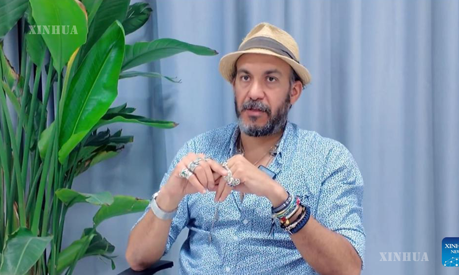 This screenshot from a video clip shows Egyptian adventurer and world traveler Ahmed Haggagovic receiving an interview with Xinhua in Nanchang, east China’s Jiangxi Province, April 21, 2026. (Xinhua/Pan Xiaojing)
