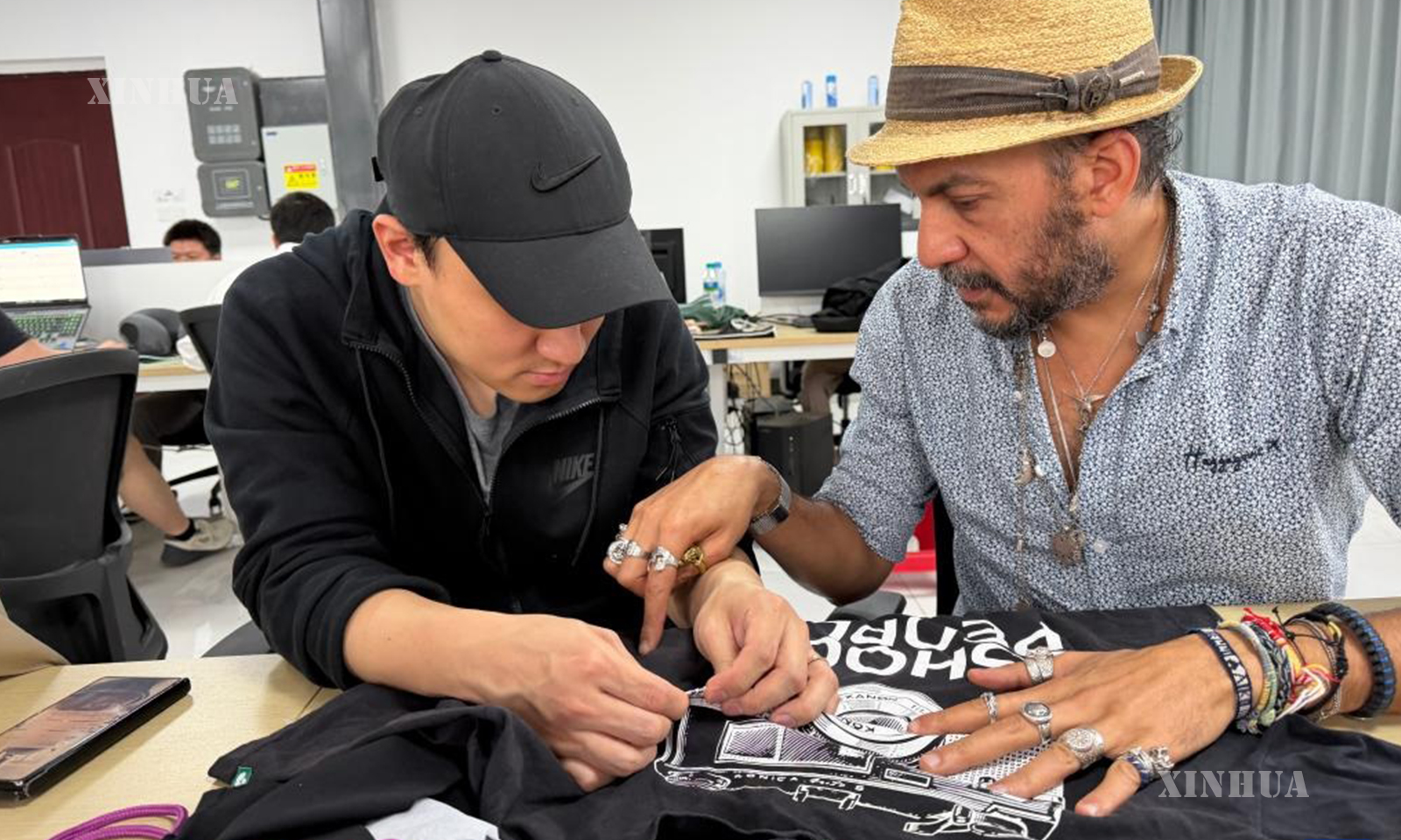 This photo taken with a mobile phone shows Egyptian adventurer and world traveler Ahmed Haggagovic (R) customizing T-shirts for his social media and fans at an export-trade clothing company in Nanchang, east China’s Jiangxi Province, April 21, 2026. (Xinhua/Pan Xiaojing)