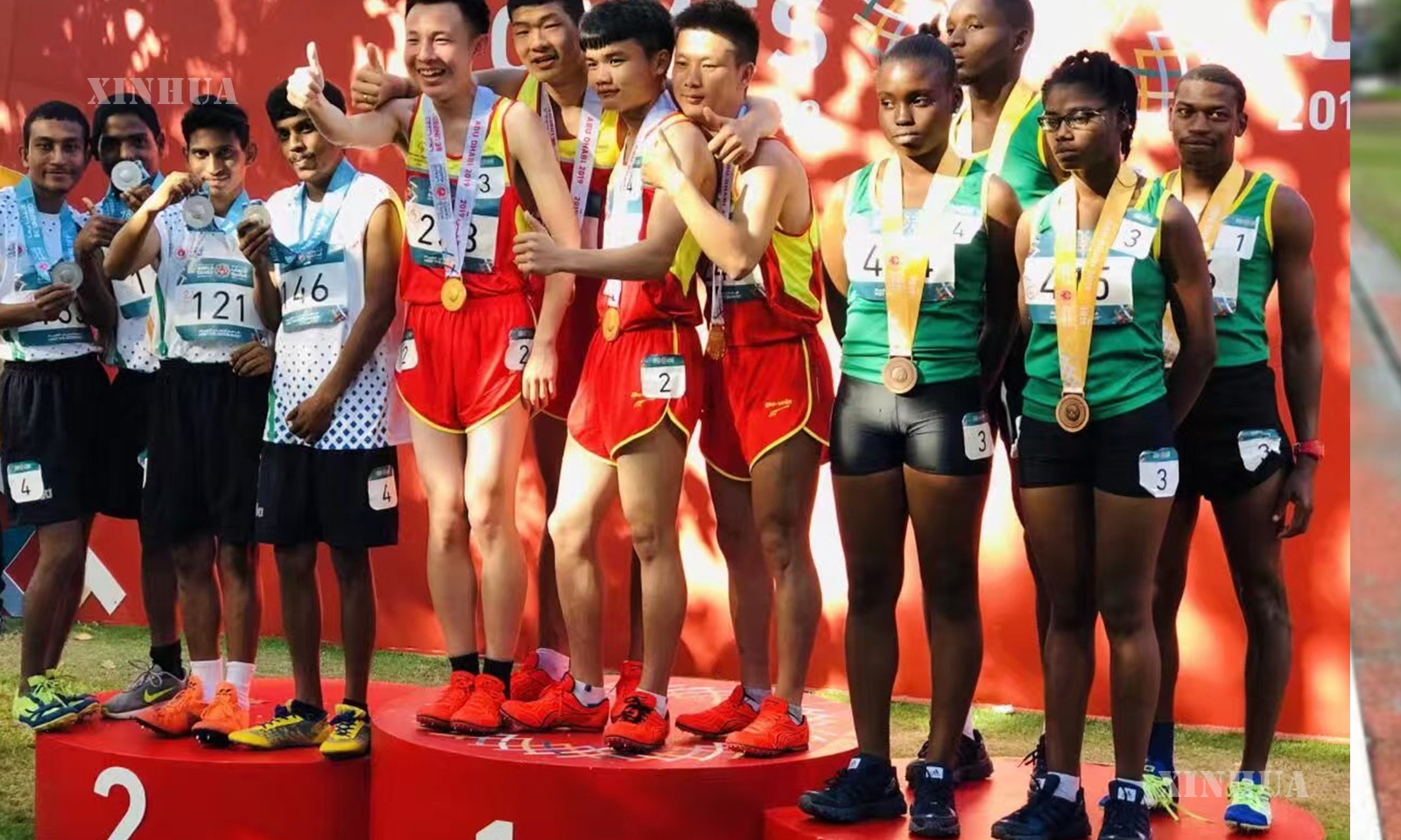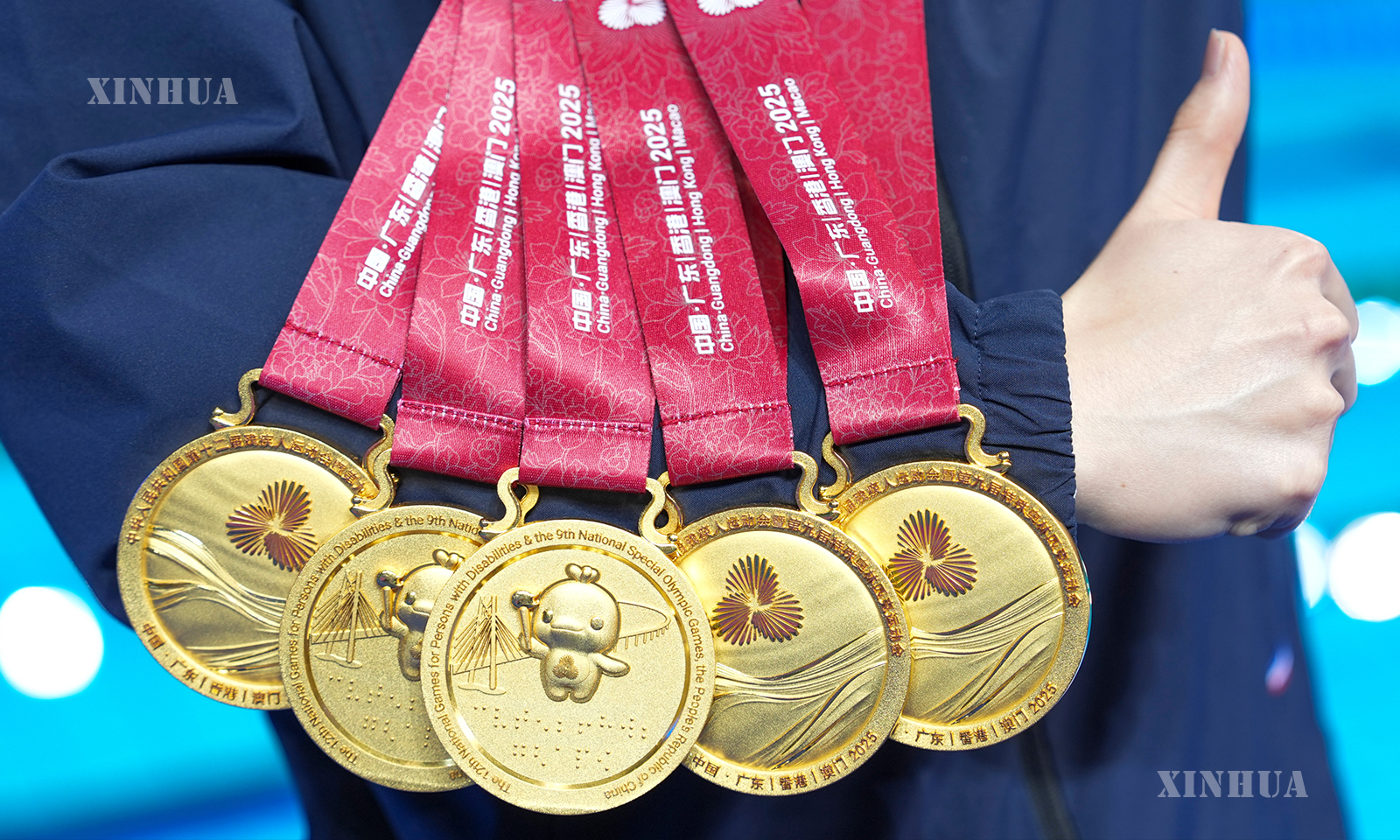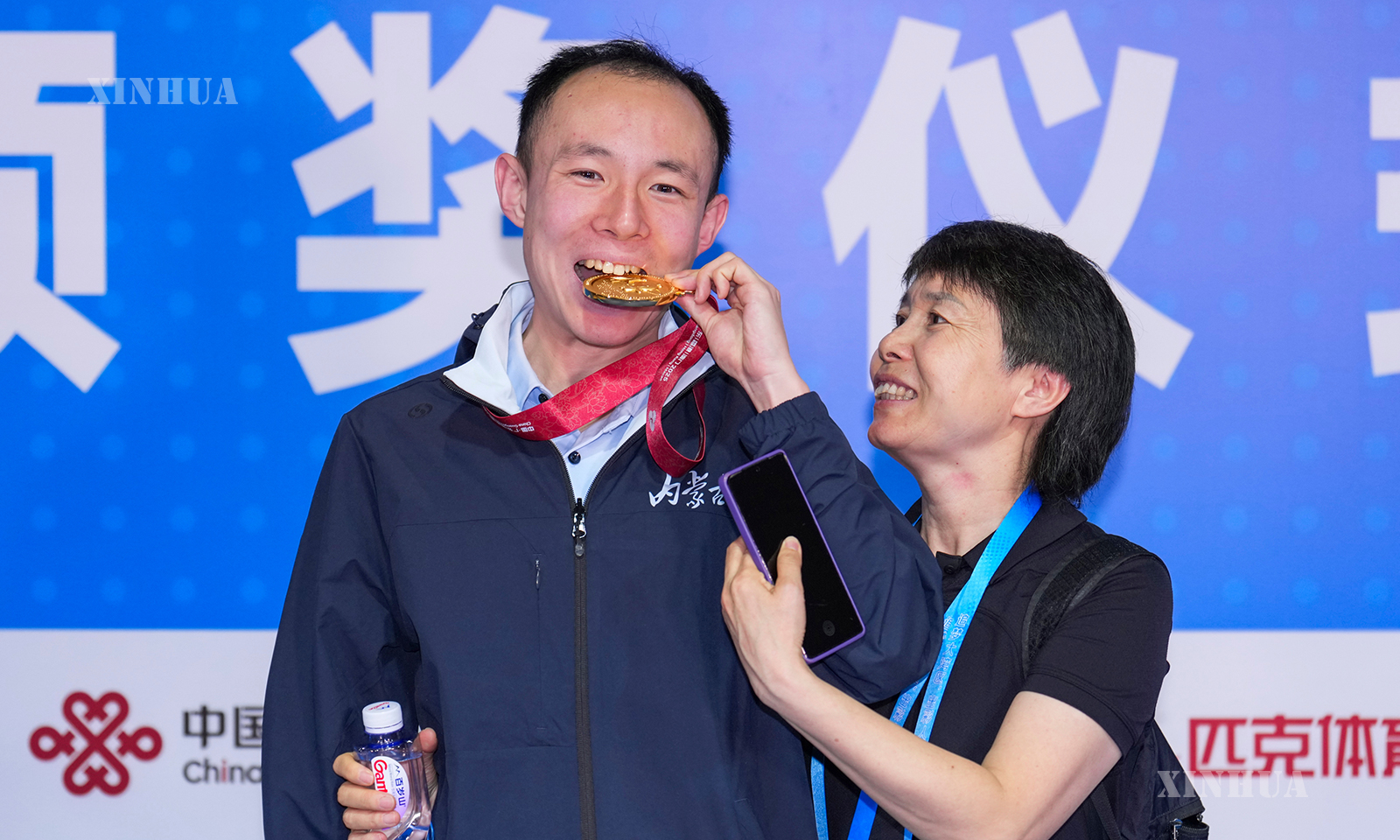 တရုတ်နိုင်ငံတွင် ကျင်းပသည့် ၁၂ ကြိမ်မြောက် မသန်စွမ်းသူများ အမျိုးသား အားကစားပြိုင်ပွဲနှင့် ၉ ကြိမ်မြောက် အမျိုးသား အထူးအိုလံပစ် အားကစားပြိုင်ပွဲတွင် အမျိုးသား ၂၂ နှစ်မှ ၂၉ နှစ် အုပ်စု မီတာ ၅၀ အလွတ်ကူး ပထမအဖွဲ့ ဆုချီးမြှင့်ပွဲ အခမ်းအနားပြီးနောက် ရွှေတံဆိပ်ဆုရှင် စွန်းယွီလျန့် (ဝဲဘက်) နှင့် ၎င်း၏မိခင်ဖြစ်သူတို့ အမှတ်တရဓာတ်ပုံရိုက်ကူးနေသည်ကို ၂၀၂၅ ခုနှစ် ဒီဇင်ဘာ ၁၂ ရက်က တွေ့ရစဉ် (ဆင်ဟွာ)