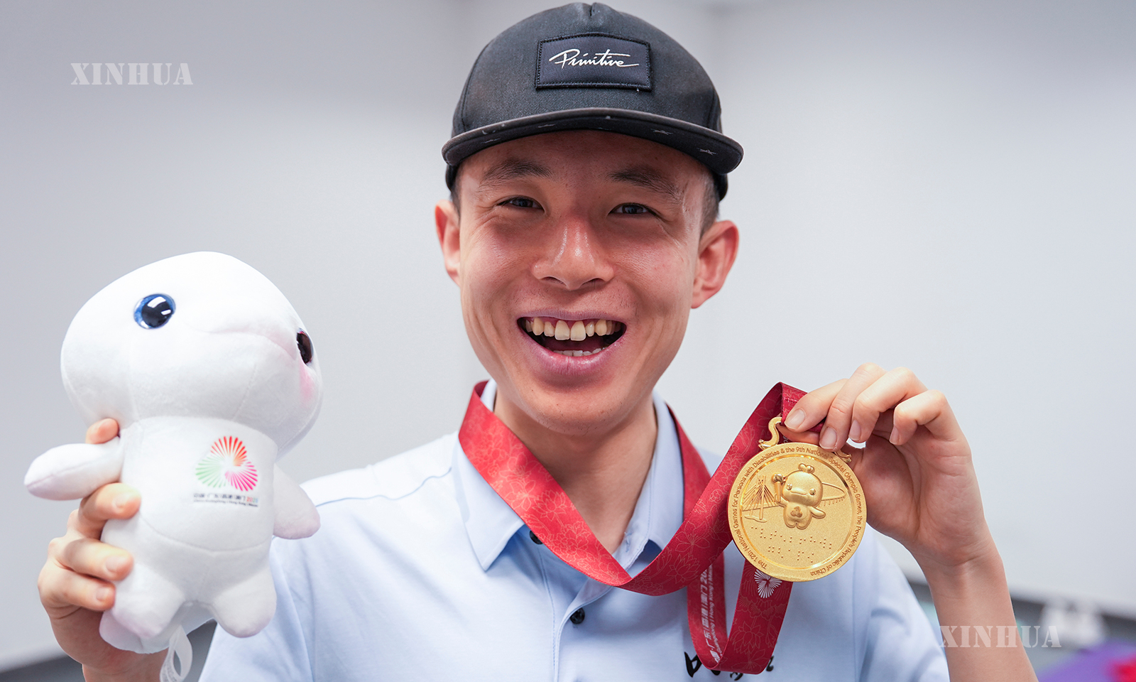 图说1:12月14日,孙宇亮展示本届赛会获得的五枚金牌。 新华社记者 伍志尊 摄