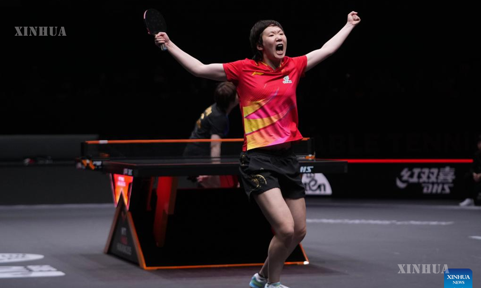Wang Manyu celebrates after the women’s singles final between Wang Manyu of China and Kuai Man of China at the WTT Finals Hong Kong 2025 in Hong Kong, south China, Dec. 14, 2025. (XinhuaLui Siu Wai)