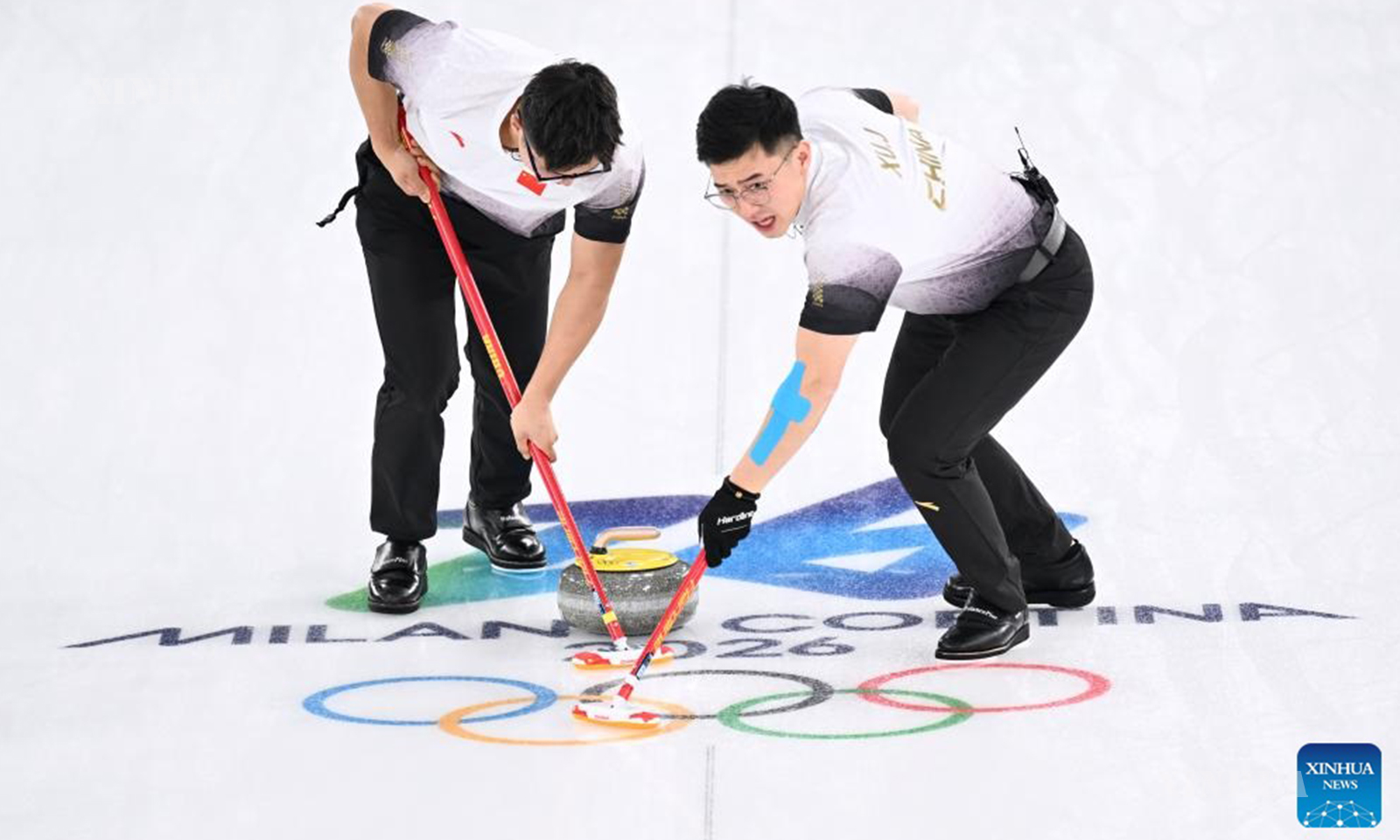 Xu Jingtao (R) and Li Zhichao of China compete during the curling men round robin session 5 match between China and Sweden at the 2026 Milan-Cortina Winter Olympics in Cortina, Italy, Feb. 14, 2026. (Xinhua/Lian Yi)