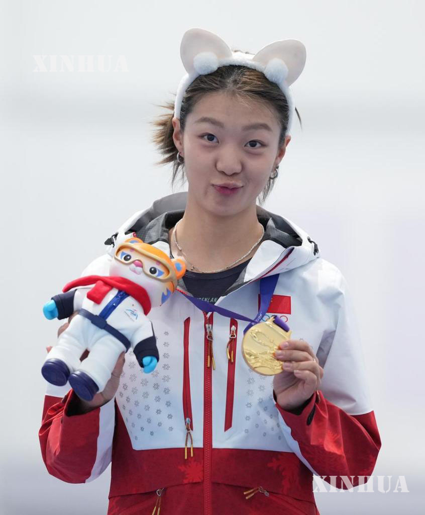 တရုတ်နိုင်ငံ အရှေ့မြောက်ပိုင်း ဟေးလုံကျန်းပြည်နယ် ဟားအယ်ပင်းမြို့တွင် ကျင်းပသော ၉ ကြိမ်မြောက် အာရှ ဆောင်းရာသီ အားကစားပြိုင်ပွဲ ဆုချီးမြှင့်ပွဲ၌ ဓာတ်ပုံရိုက်ကူးရန် ကိုယ်ဟန်ပြနေသော ယန်ပင်းယွီကို ၂၀၂၅ ခုနှစ် ဖေဖော်ဝါရီ ၁၁ ရက်က တွေ့ရစဉ် (ဆင်ဟွာ)