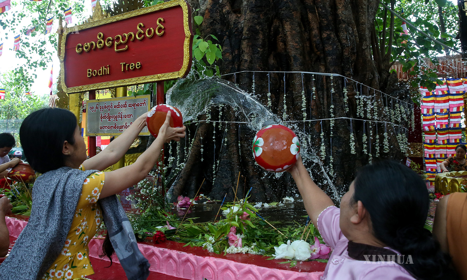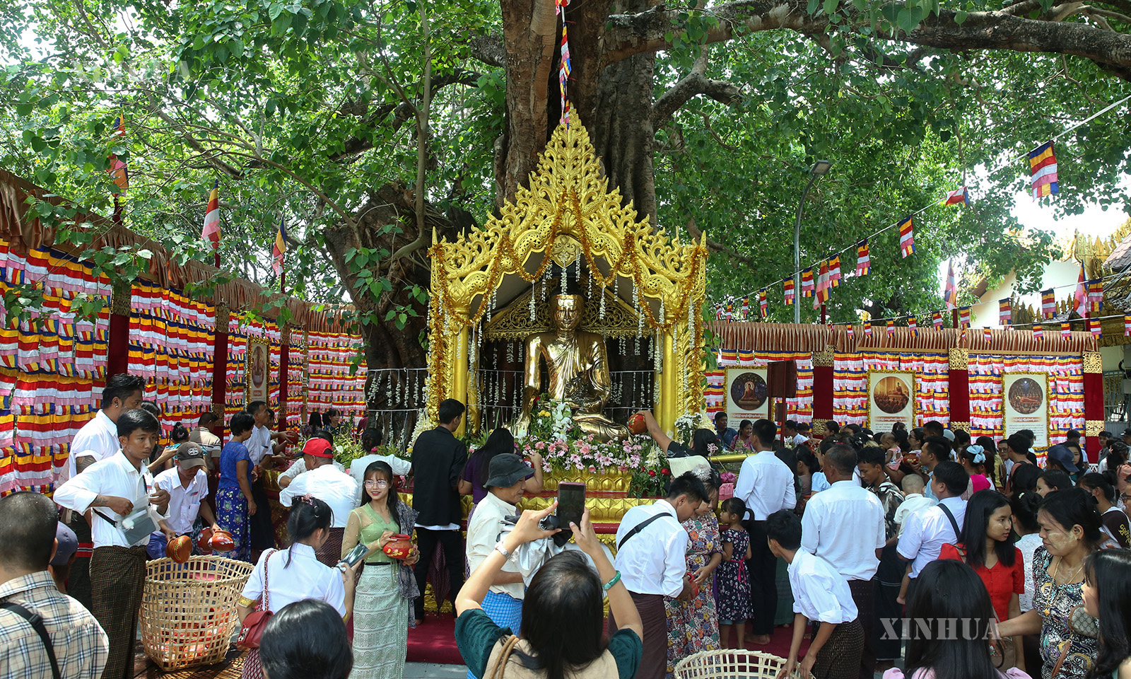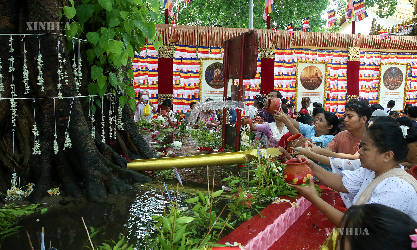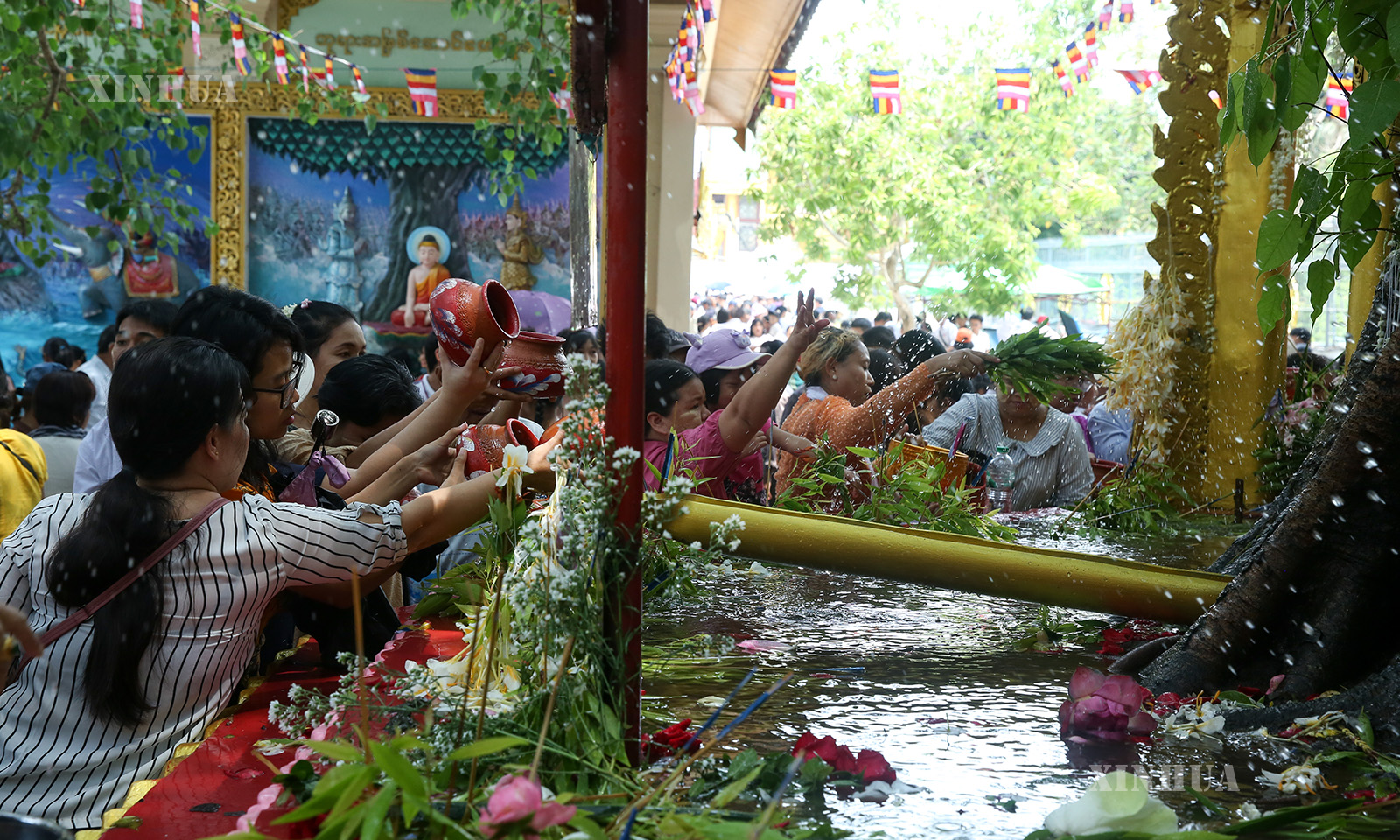ကဆုန်လပြည့်ဗုဒ္ဓနေ့တွင် မြန်မာနိုင်ငံ ရန်ကုန်မြို့ရှိ ရွှေတိဂုံစေတီတော်၌ ဘုရားဖူးပြည်သူများ ညောင်ရေသွန်းလောင်းပူဇော်ကြမှုမြင်ကွင်းများ