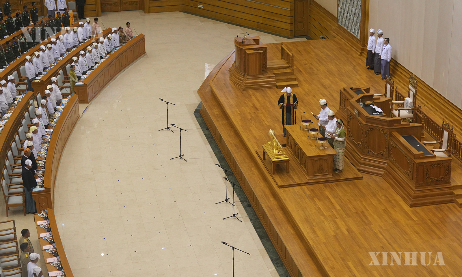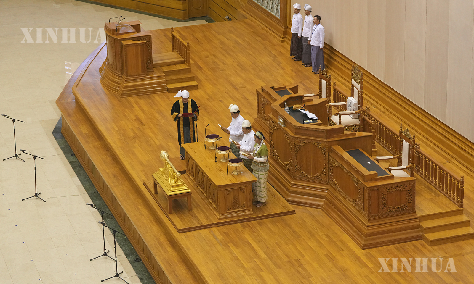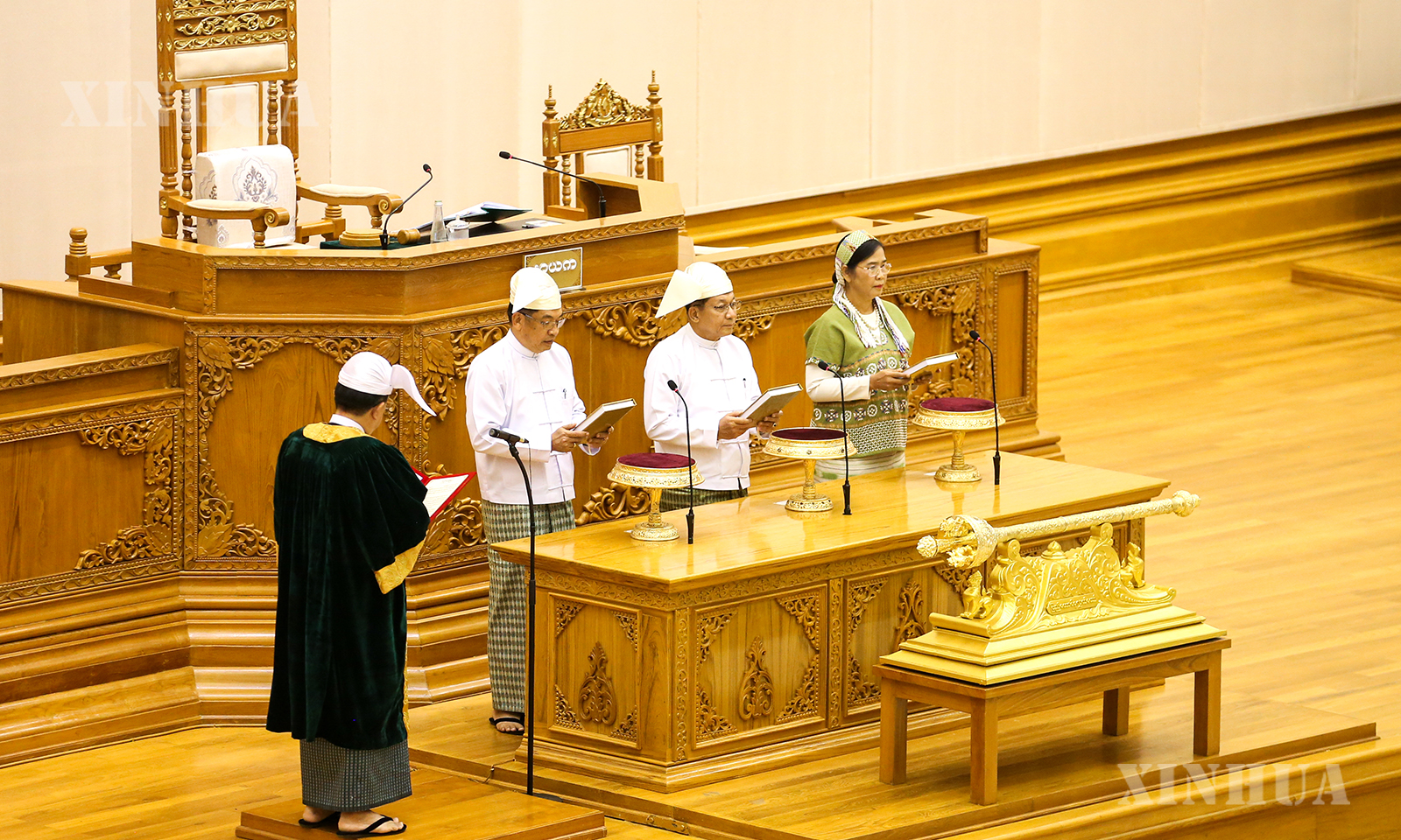 နိုင်ငံတော်သမ္မတနှင့် ဒုတိယသမ္မတများအဖြစ် ရွေးချယ်တင်မြှောက်ခံရသူများက ပြည်ထောင်စုလွှတ်တော်နာယက၏ ရှေ့မှောက်၌ ကျမ်းသစ္စာကျိန်ဆိုနေသည်ကို ၂၀၂၆ ခုနှစ် ဧပြီ ၁၀ ရက်က တွေ့ရစဉ် (ဆင်ဟွာ)