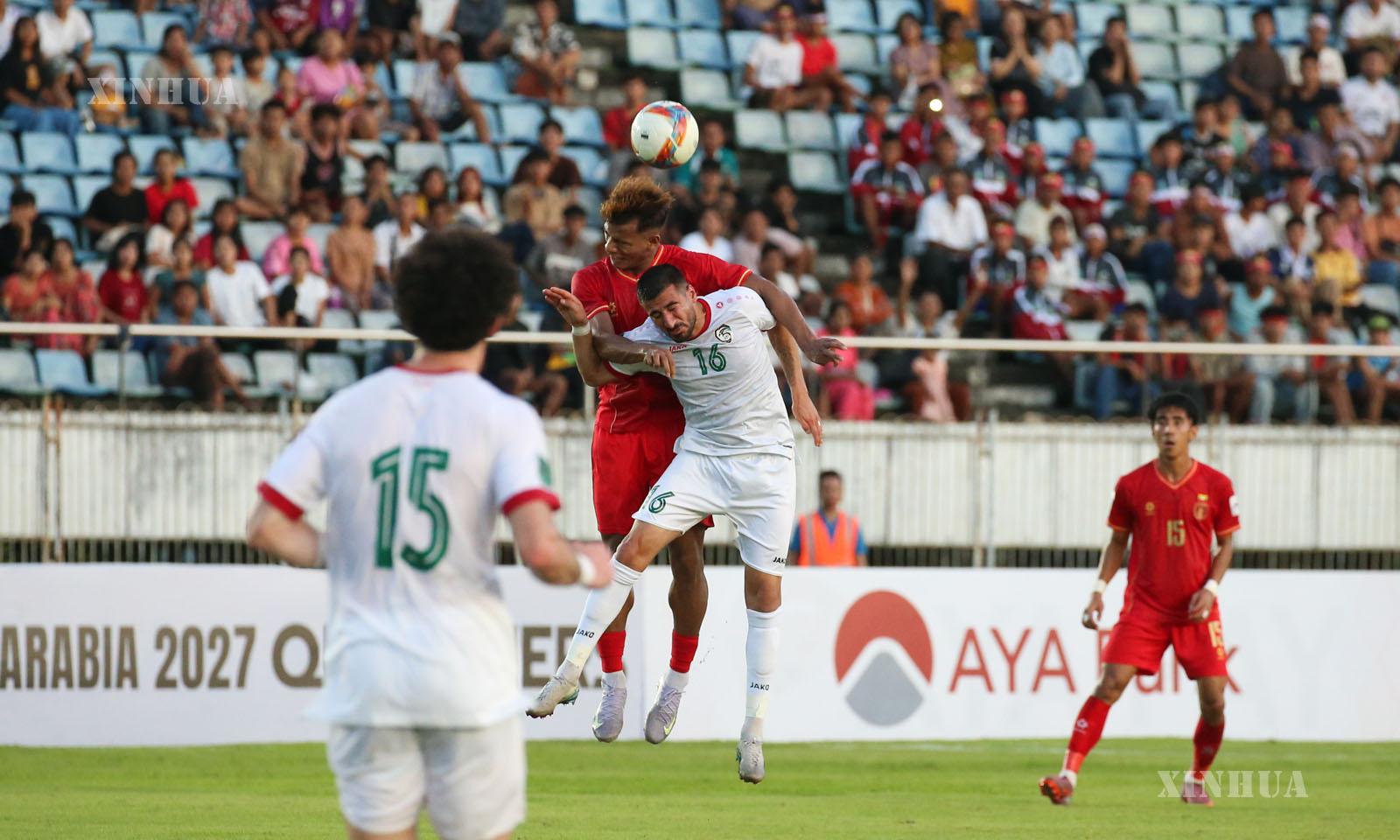 ၂၀၂၇ အာရှဖလားခြေစစ်ပွဲ တတိယအဆင့် အုပ်စု ပွဲစဉ် တစ်ပွဲအဖြစ် မြန်မာ့လက်ရွေးစင် အသင်းနှင့် ဆီးရီးယားအသင်းတို့  အောက်တိုဘာ ၁၄ရက်က မြန်မာနိုင်ငံ ရန်ကုန်မြို့ သုဝဏ္ဏကွင်းတွင် ယှဉ်ပြိုင်ကစားခဲ့ရာ မြန်မာအသင်းက သုံးဂိုး ဂိုးမရှိဖြင့်ရှုံးနိမ့်ခဲ့သည်။ (Xinhua)