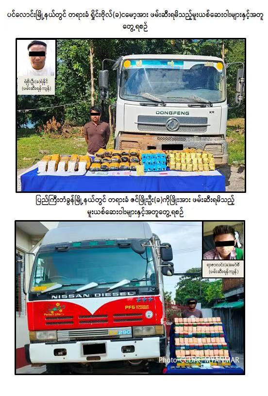 စစ်ဆေးပေါ်ပေါက်ချက်များအရ ဖမ်းဆီးရမိ မော်တော်ယာဉ် ၂ စီး၏ပိုင်ရှင် ရဲစိုးဦး(ခ)ရဲနိုင် (ဖမ်းဆီးရန်ကျန်) သည် မိုင်းရယ်မြို့မှ မူးယစ်ဆေးဝါးနှင့် စိတ်ပြောင်းဆေးဝါးများကို ကရင်ပြည်နယ်၊ ဘားအံမြို့သို့လည်းကောင်း၊ မန္တလေးမြို့သို့လည်းကောင်း၊ ဘုတလင်မြို့နယ်နေ ရာဇာလင်း(ခ)မော်စီ (ဖမ်းဆီးရန်ကျန်)နှင့် ရှိုင်းဗိုလ်(ခ)ငမော့တို့အား သယ်ဆောင်ခိုင်းခြင်းဖြစ်ကြောင်း သိရှိရသဖြင့် ၎င်းတို့အား မူးယစ်ဆေးဝါးနှင့် စိတ်ကိုပြောင်းလဲစေသော ဆေးဝါးများဆိုင်ရာဥပဒေအရ အရေးယူထားရှိပြီး ကွင်းဆက်ပြစ်မှုကျူးလွန်သူများအား ဆက်လက်ဖော်ထုတ်လျက်ရှိကြောင်း CCDAC MYANMAR က ထုတ်ပြန်သော သတင်းအရ သိရသည်။ (Xinhua)