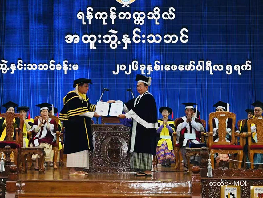 မြန်မာနိုင်ငံ၏ ယာယီသမ္မတ ဗိုလ်ချုပ်မှူးကြီး မင်းအောင်လှိုင်ကို ရန်ကုန်တက္ကသိုလ်မှ ဂုဏ်ထူးဆောင် ပြည်သူ့ရေးရာ စီမံခန့်ခွဲမှု ပါရဂူဘွဲ့အပ်နှင်း