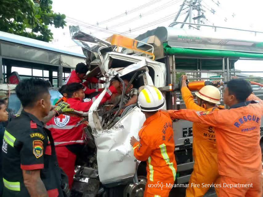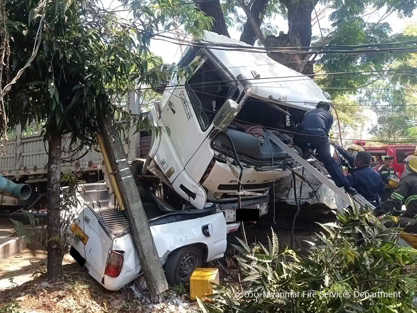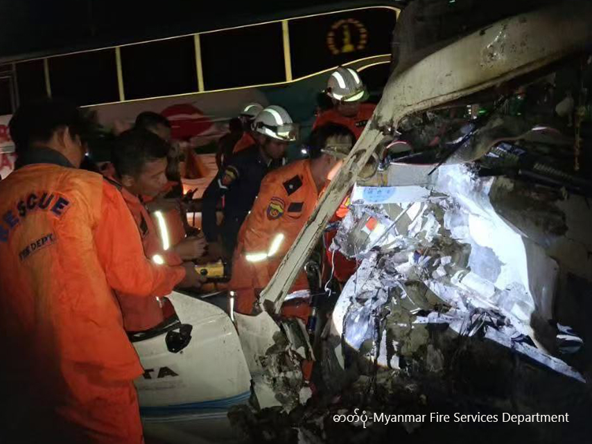 ရန်ကုန်-မန္တလေး အမြန်လမ်းမပေါ်တွင် ဖြစ်ပွါးခဲ့သော ယာဉ်မတော်တဆမှုများအား တွေ့ရစဉ် (ဓာတ်ပုံ-Myanmar Fire Services Department)