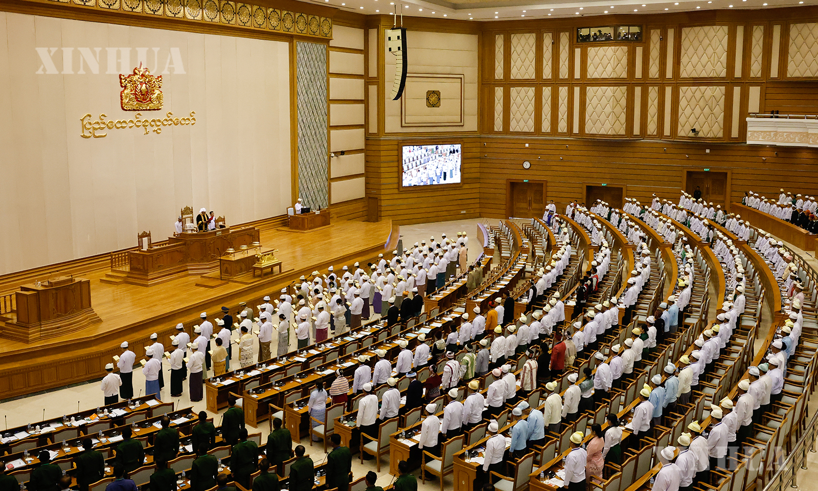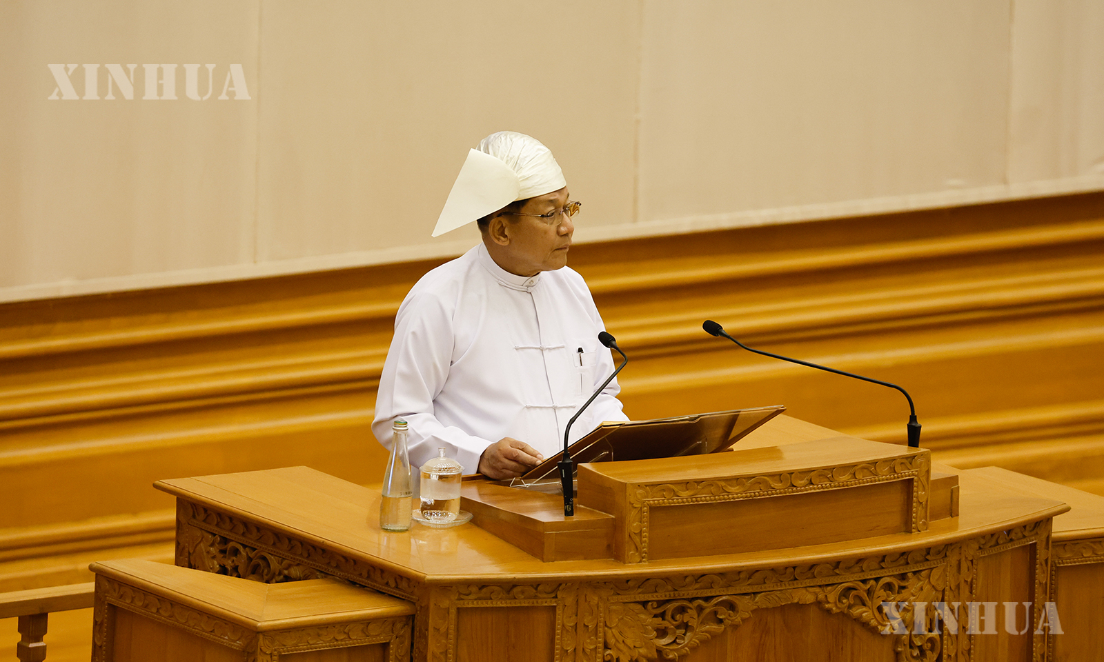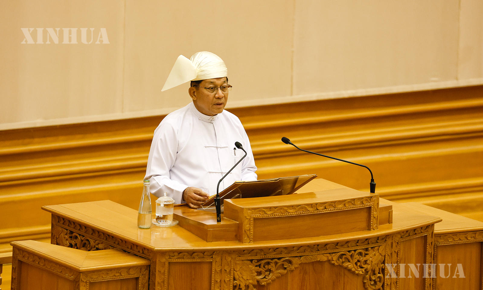 မြန်မာနိုင်ငံ နေပြည်တော်တွင် ၂၀၂၆ ခုနှစ် ဧပြီ ၁၀ ရက်၌ တတိယအကြိမ် ပြည်ထောင်စုလွှတ်တော်၊ ပထမပုံမှန်အစည်းအဝေး ဆဋ္ဌမနေ့ကျင်းပစဉ်အတွင်း မိန့်ခွန်းပြောကြားနေသော နိုင်ငံတော် သမ္မတ ဦးမင်းအောင်လှိုင်ကို တွေ့ရစဉ် (ဆင်ဟွာ)